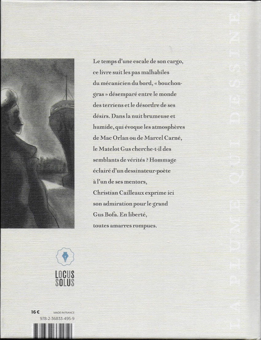 Résumé: Le Matelot Gus dure le temps d’une escale, un port comme tant d’autres, où l’on débarque en suivant les pas malhabiles du “bouchon-gras” désemparé dans le monde des terriens, le désordre des désirs et le tumulte de la ville. Dans une nuit brumeuse et humide, il cherche des semblants de vérités mais son errance le ramène jusqu’au bateau, matrice rassurante et abri de ses rêves... de prochaine escale. e S’il est bien un artiste dont Christian Cailleaux revendique l’influence, c’est Gus Bofa (1883-1968). Illustrateur culte du 20 siècle, Bofa se distingue par le caractère charbonneux et texturé de ses images qui ont illustré des auteurs de son époque (Mac Orlan, Mirbeau…) ou du passé (Swift, Voltaire, Cervantès…), dans un imaginaire souvent rattaché au port et aux bateaux. De cette démarche sont nées une partie de ses œuvres marquantes, notamment pour L’Oiseau rare de l’écrivain Jacques Perret. Christian Cailleaux s’abreuve depuis longtemps du travail de Bofa. Il réalise avec les 24 planches du Matelot Gus une variation poétique et baroque autour de l’univers de son maître. Disponibles uniquement en feuilles volantes (édition d’artiste), c’est la première fois qu’un recueil réunit ce court mais précieux travail.