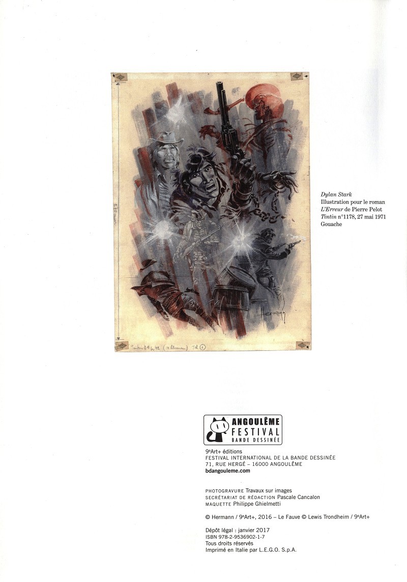 Info édition : Catalogue de l'exposition Hermann présentée du 26 au 29.01.2017 à Angoulême. Tirage 2000 exemplaires. Couverture cartonnée. 128 pages imprimées en quadrichromie sur papier Muncken pur 150 g. Format 250 x 350 mm.