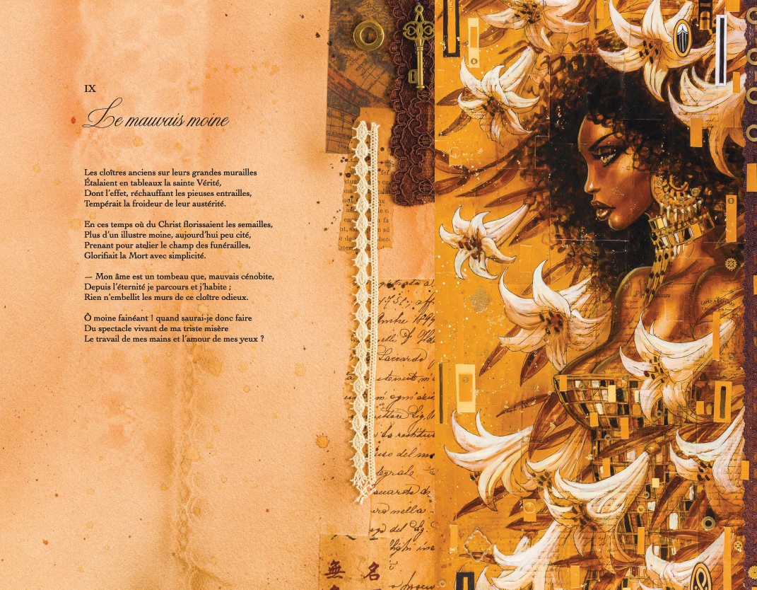 Illustrateur, peintre et auteur d'une trentaine de bandes dessinées (Le Troisième Oeil, Wika, Requiem, Chroniques de la Lune Noire), Olivier Ledroit revient avec un défi digne de son sens de la démesure, de sa générosité visuelle et de sa passion pour les mondes oniriques, en adaptant le chef-d'oeuvre de Charles Baudelaire, Les Fleurs du mal. En faisant revivre cette oeuvre, Olivier Ledroit propose un regard singulier sur l'univers du poète, à travers le prisme de son propre univers, si apprécié des amateurs de bande dessinée et des collectionneurs d'art. « Je ne souhaitais pas me contenter d'illustrer les poèmes de Baudelaire, détaille Olivier Ledroit. D'autres l'ont fait avant moi. L'objectif est plutôt de reproduire le bain culturel dans lequel a trempé Baudelaire. Ses visions, ses angoisses, ses inspirations, son monde, son Paris du XIXe siècle ». Connu pour ses incroyables planches épiques autant que pour la délicatesse et la sensualité de ses figures, de ses formes et de ses compositions, retrouvez dans les pages de ce bel ouvrage toute la puissance de son trait. Les femmes splendides côtoient ici les monuments parisiens, les chats, les têtes de mort et les fantasmes tirés de substances psychotropes. Tantôt éclatant de couleurs, tantôt mélancolique ou célébrant les corps féminins, c'est un voyage esthétique inédit au plus près du poète maudit du XIXe siècle que nous propose Olivier Ledroit dans ce superbe ouvrage en grand format à l'italienne.