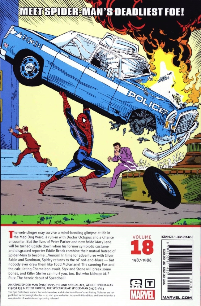 Résumé: Meet Spider-Man's deadliest foe! The web-slinger may survive a mind-bending glimpse at life in the Mad Dog Ward, a run-in with Doctor Octopus and a Chance encounter. But the lives of Peter Parker and new bride Mary Jane will be turned upside down when his former symbiotic costume and disgraced reporter Eddie Brock combine their mutual hatred of Spider-Man to become…Venom! In time for adventures with Silver Sable and Sandman, Spidey returns to the ol' red-and-blues — but nobody ever drew them like Todd McFarlane! The cunning Fox and the calculating Chameleon await. Styx and Stone will break some bones, and Killer Shrike can hurt you, too. But who kidnaps MJ? Plus: The heroic debut of Speedball!