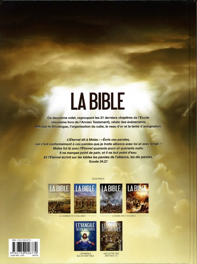 Résumé: Après avoir infligé les dix plaies à l'Égypte et libéré le peuple hébreu du joug de Pharaon, Moïse conduit les siens jusqu'à la Terre promise. Cette deuxième et dernière partie s'applique à présenter chronologiquement les étapes-clés qui jalonnèrent cette période : l'arrivée au pied du mont Sinaï, la remise des Tables de la Loi et des Dix Commandements ainsi que les quarante ans d'errance dans le désert.