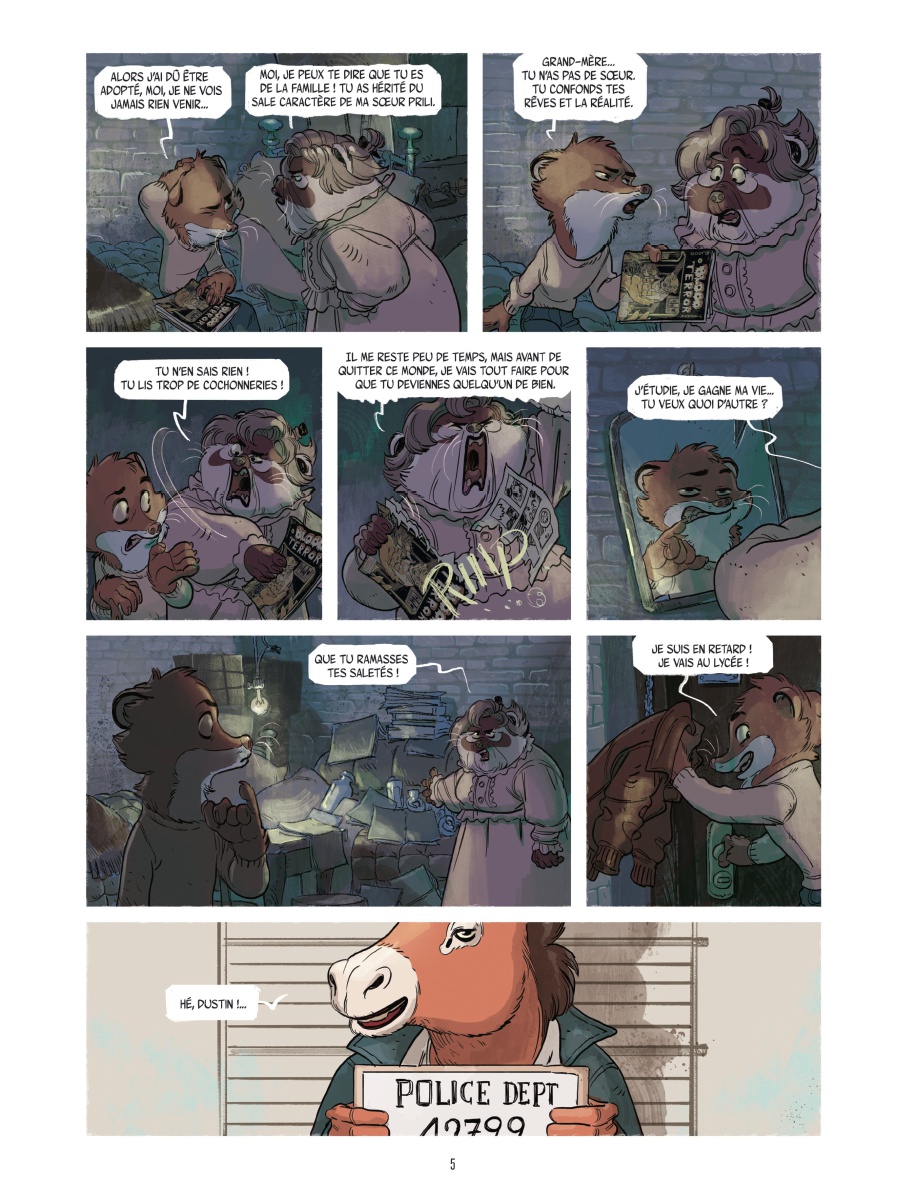 iré de son lycée, Dustin Kalisnowszczyzna exerce sa passion pour la photographie dans un contexte un peu particulier. Au beau milieu d’un commissariat, défilent sous son objectif les différents individus interpellés par les forces de l’ordre. Il faut bien gagner sa vie, alors autant que cela soit avec un appareil photo dans les pattes. Mais l’aventure tourne court, et le mustélidé se retrouve sur le carreau. Sa grand-mère, bigote absolue avec qui il vit, a décidé de reprendre les choses en mains et dégote un nouveau boulot un peu spécial à son petit-fils…