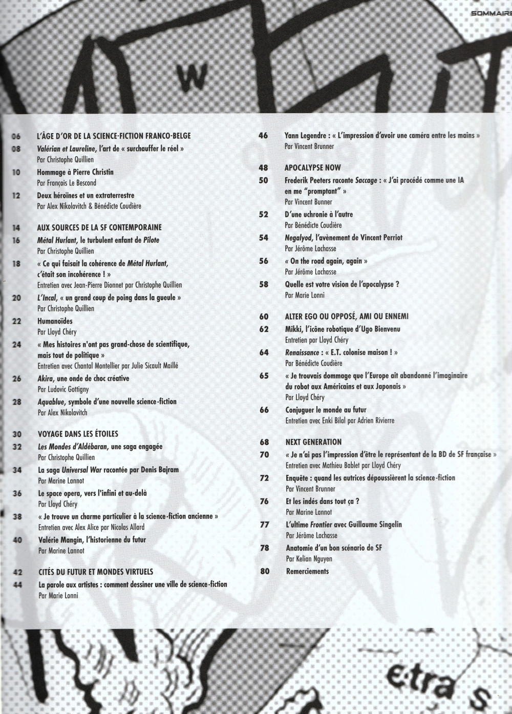 Résumé: Catalogue qui se situe entre le guide de lecture et magazine, qui présente sous forme de chapitres commentés et illustrés, les 40 dernières années de la création en science fiction de la bande dessinée franco- belge. Six chapitres : L'âge d'or de la science-fiction franco-belge - Aux sources de la SF contemporaine - Voyage dans les étoiles - Cités du futur et mondes virtuelles - Apocalypse now - Alter ego ou opposé, ami ou ennemi - Next génération. Préface de Vincent Eches, directeur général de la cité internationale de la bande dessinée et de l'image d’Angoulême et de Lloyd Chéry & Julie Sicault Maillé, co-commissaires de l’exposition Plus loi-La nouvelle science fiction. Couverture : Mathieu Bablet.