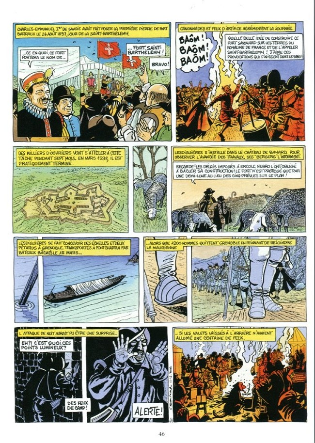Monsieur Bouchard connaît manifestement bien son sujet et sa mise en lumière est très didactique, au point d’être quelque peu austère. Il faut dire qu’il n’est pas aisé de retracer en cinquante-six pages le parcours d’un homme mort à l’âge de quatre-vingt-trois ans et qui participa activement à l’un des épisodes les plus sanglants de l’Histoire de France. Le scénario s’attache surtout aux faits d’armes et ne dispose que peu de place pour parler de l’humain. Heureusement, l’introduction d’un élément fantastique via la présence de Lucifer – avec qui le père du futur duc a conclu un pacte garantissant à son fils longue vie, gloire, fortune et amour – qui commente les événements donne un aspect truculent bien venu. Cet effet est plaisant et habile car s’inspirant sans doute d’une légende (La Pierre Percée de la Motte d'Aveillans) entourant le personnage qui veut que ce dernier, à l’âge de quatre-vingts ans, ait eu des relations avec Satan afin d’agrandir le mur du parc de son château de Vizille.