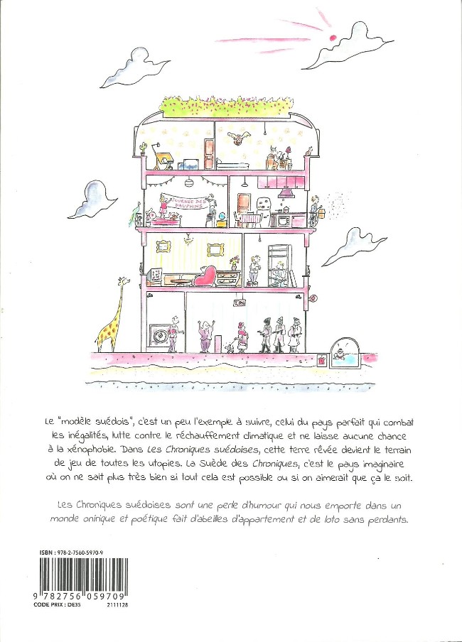 Extraites d'un blog, ces Chroniques suédoises ne manquent pas de cachet. L'auteur embarque au fil des pages ses lecteurs dans un monde poétique complètement décalé. Dans sa Suède, la loterie brasse les rêves des habitants et ne fait jamais de perdants, les piscines se déplient et permettent de raccorder plusieurs stations comme de véritables métros, les zoos sont remplacés par des safaris urbains, les abeilles domestiquées et les braqueurs se comportent tous comme des gentlemans.