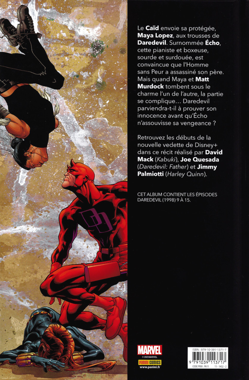 Résumé: Le Caïd envoie sa protégée, Maya Lopez, aux trousses de Daredevil. Surnommée Echo, cette pianiste et boxeuse, sourde et surdouée, est convaincue que l'Homme sans Peur a assassiné son père. Mais quand Maya et Matt Murdock tombent sous le charme l'un de l'autre, la partie se complique... Daredevil parviendra-t-il à prouver son innocence avant qu'Echo n'assouvisse sa vengeance ? Retrouvez les débuts de la nouvelle vedette de Disney+ dans ce récit réalisé par David Mack (Kabuki), Joe Quesada (Daredevil : Father) et Jimmy Palmiotti (Harley Quinn).