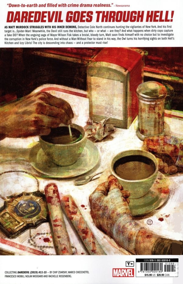 Résumé: Daredevil goes through hell! As Matt Murdock struggles with his inner demons, Detective Cole North continues hunting the vigilantes of New York. And his first target is…Spider-Man! Meanwhile, the Devil still runs the Kitchen, but who — or what — are they? And what happens when dirty cops capture a fake DD? When the ongoing saga of Mayor Wilson Fisk takes a brutal, bloody turn, Matt soon finds himself with no choice but to investigate the corruption in New York’s police force. And without a Man Without Fear to stand in his way, the Owl turns his horrifying sights on both Hell’s Kitchen and Izzy Libris! The city is descending into chaos — and a protector must rise! Collecting DAREDEVIL (2019) #11-15.