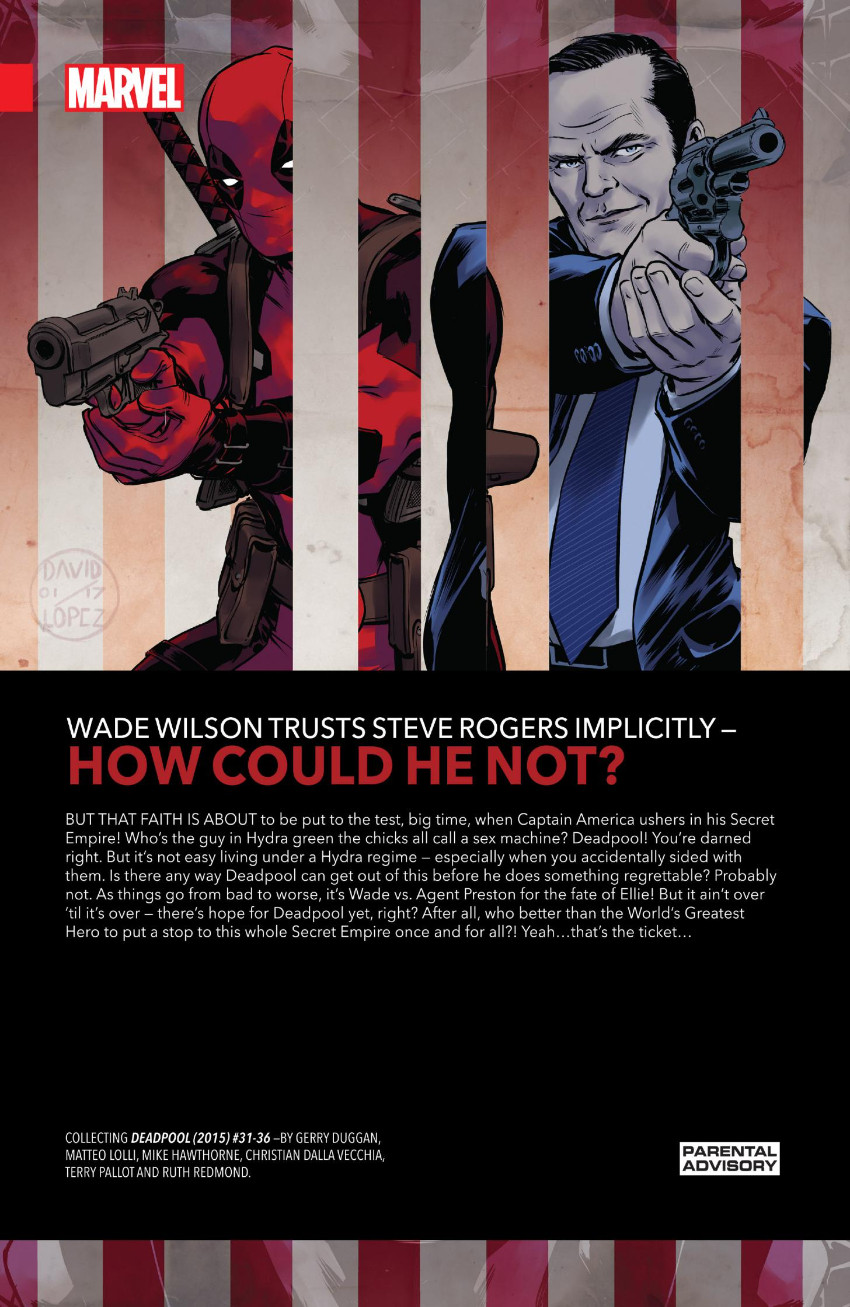 Résumé: Deadpool takes on the event storyline of 2017: Secret Empire! But which side will he choose and how will he face down the fallout Wade Wilson trusts Steve Rogers implicitly how could he not But that trust is about to be put to the test, big-time! Deadpool has spent his super hero career cracking jokes, but this situation is serious - and big changes are coming for the Merc With A Mouth...