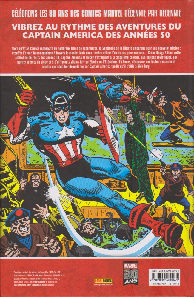 Résumé: Nous poursuivons notre visite dans chaque décennie. C’est au tour de Captain America et Bucky d’être au centre de cet album qui révèle des aventures inédites en France. (Contient les épisodes US Young Men 24-28, Captain America (1954) 76-78, Men's Adventures 27-28 et Captain America : Theater of War – America First!, inédits)
