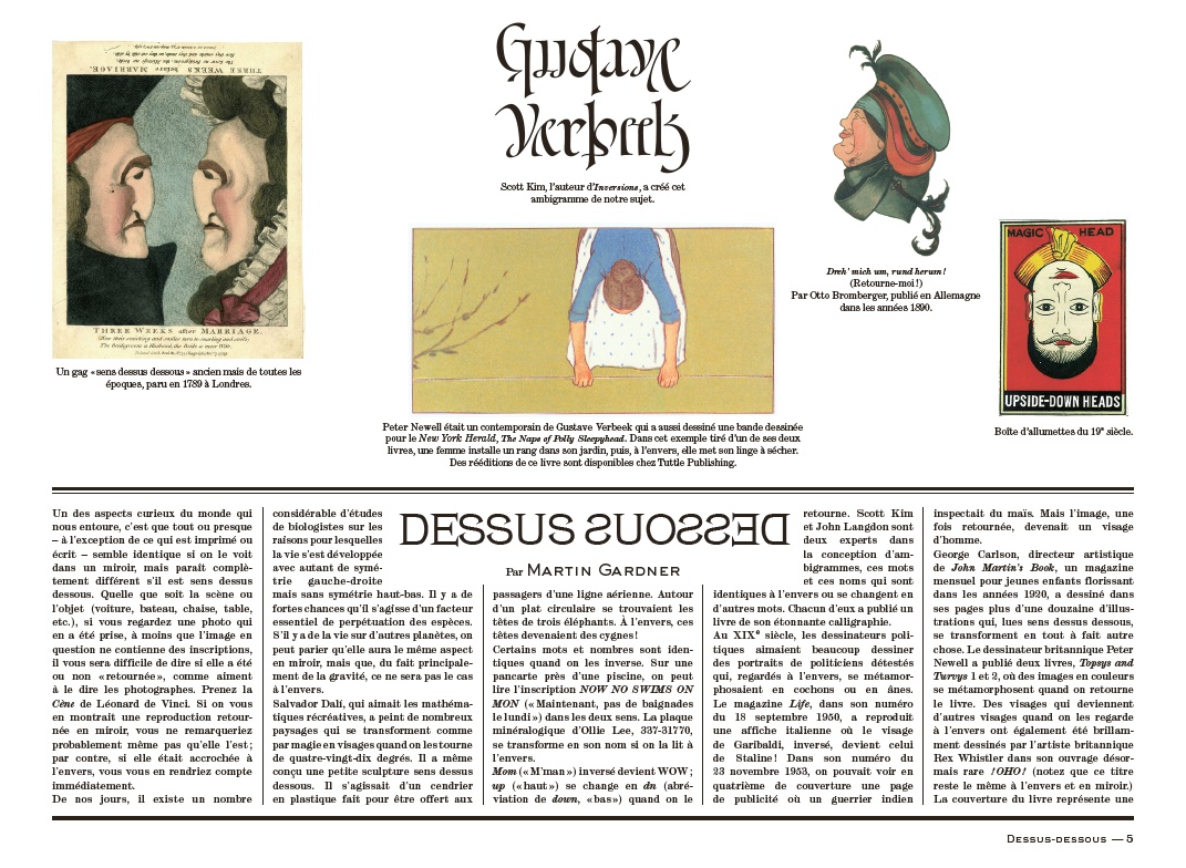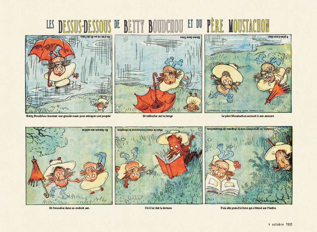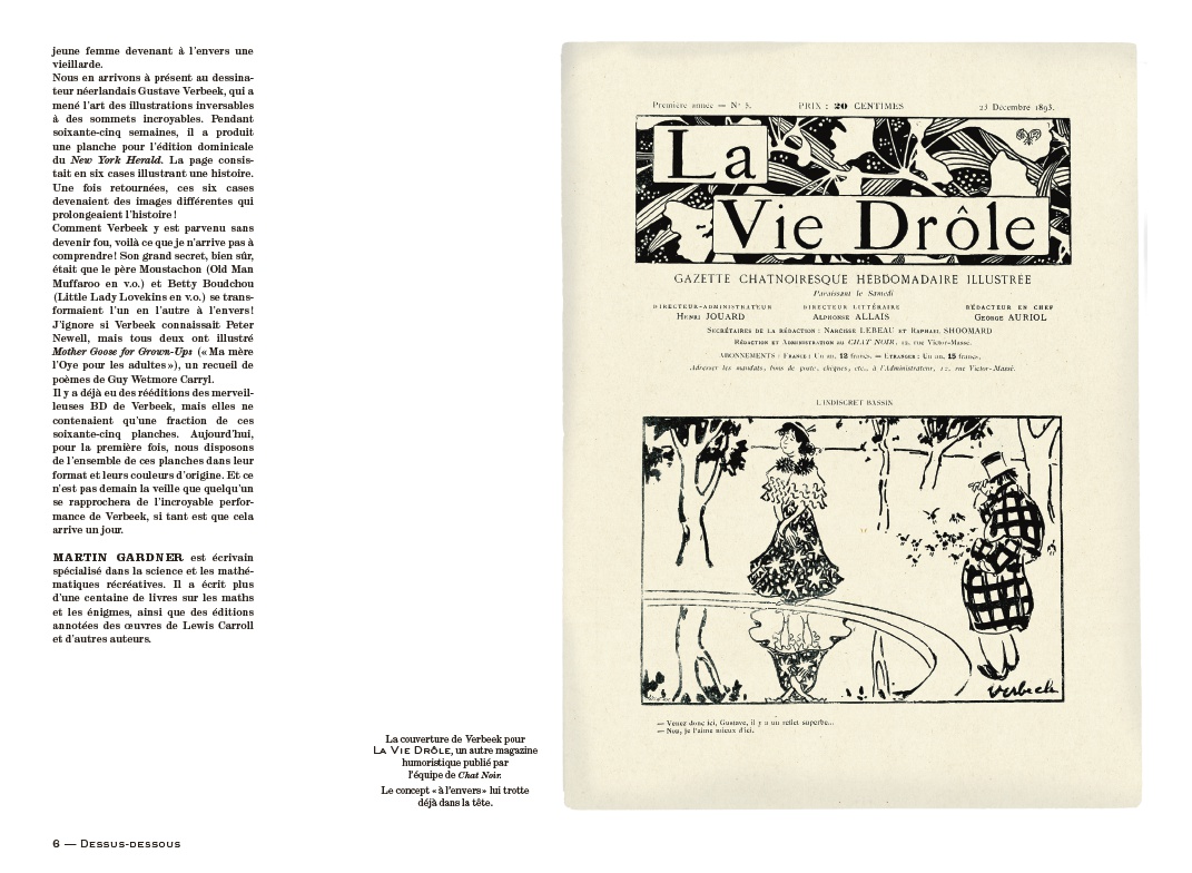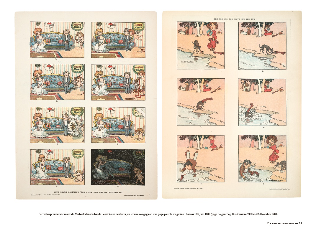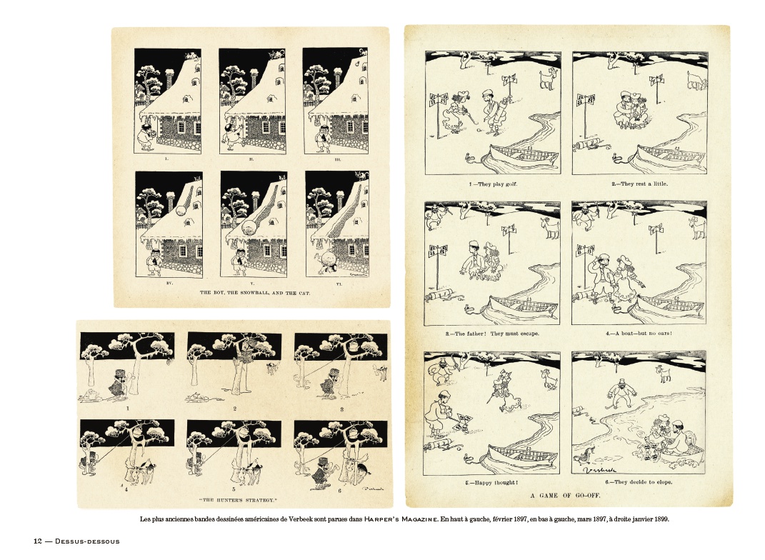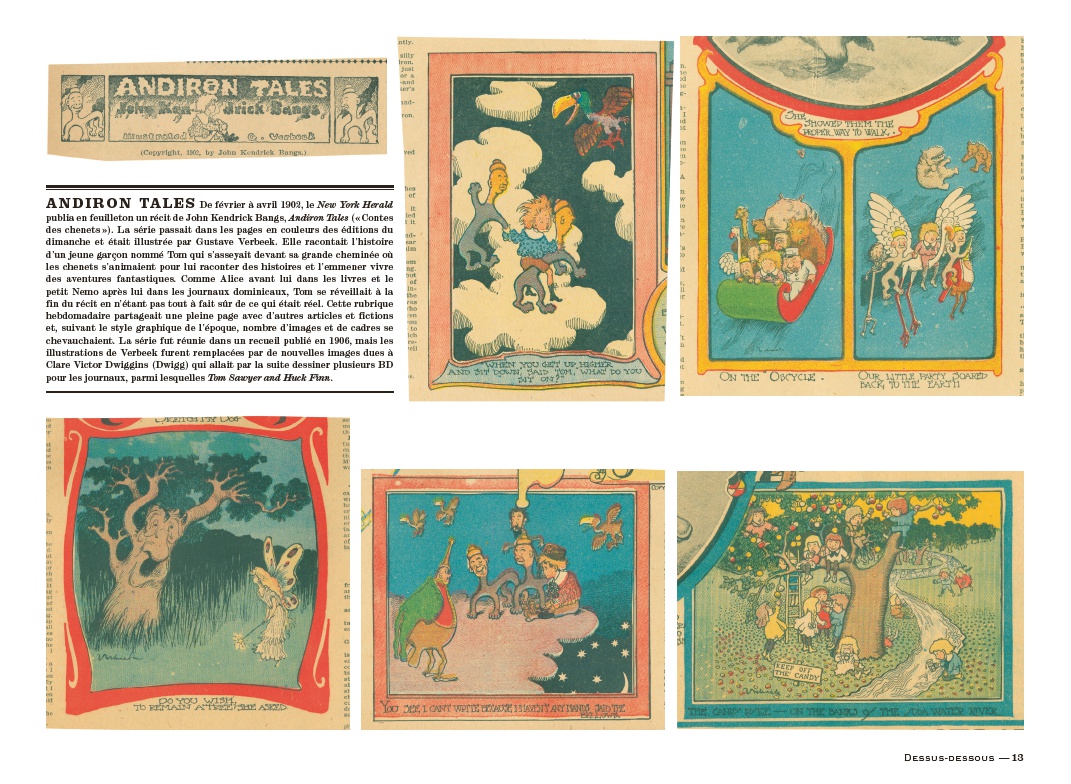 Ce chef-d’œuvre, anté-oubapien, date du tout début du XXe siècle et est contemporain des délires oniriques du Little Nemo de Winsor McCay. Il faudra toutefois attendre 1977 pour voir les strips de Gustave Verbeek traduits en français par l’éditeur Pierre Horay (avec réédition en 1978). Malheureusement, cette première version francophone n’était pas une intégrale des ‘Upside-Downs’ de Verbeek, mais surtout, elle était colorisée, et avec quelles couleurs criantes !! Ces couleurs masquant voire faisant disparaître plein de détails présents au départ. Nombre de bédéphiles ont crié au scandale, sachant que les strips originaux étaient majoritairement monochromes, seuls quelques-uns étant colorisés, avec des tons pastel. Merci donc à l’équipe des éditions Guy Delcourt de nous restituer ce chef d’œuvre dans son intégralité, et avec la colorisation d’origine. De plus, le format à l’italienne, avec des doubles strips de 3 cases, est plus facile à lire et comprendre que le format A4 avec 3x2 cases. Il faut aussi signaler la remarquable introduction par Martin Gardner qui, non seulement présente les autres œuvres de Gustave Verbeek, mais fait aussi un état des lieux du phénomène upside-down de l’époque. Un seul regret : pourquoi avoir voulu francisé le nom des 2 héros de la série (Little Lady Lovelinks & Old Man Muffaroo) en ‘Betty Boudchou’ et ‘Père Moustachon’. Un peu ridicule, sauf peut-être pour gagner un peu de place/caractères dans les légendes des cases. Sinon, chapeau pour ce travail qui remet à l’honneur un ouvrage franchement méconnu du grand public.BDGest 2014 - Tous droits réservés