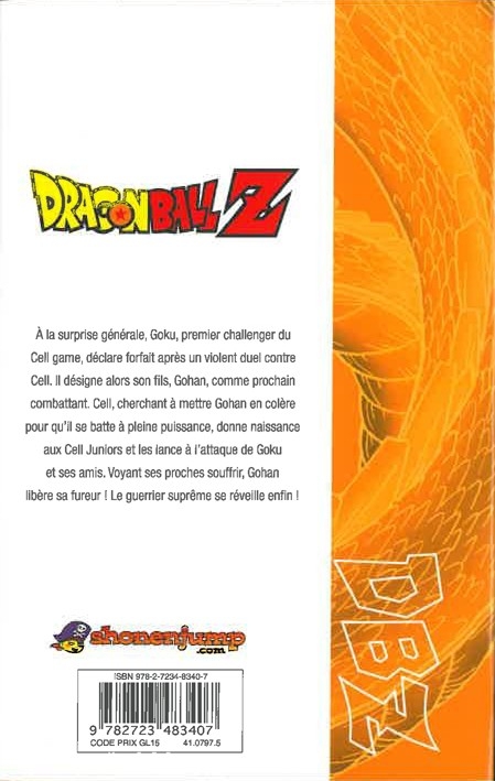 Résumé: À la surprise générale, Goku, premier challenger du Cell game, déclare forfait après un violent duel contre Cell. Il désigne alors son fils, Gohan, comme prochain combattant. Cell, cherchant à mettre Gohan en colère pour quil se batte à pleine puissance, donne naissance aux Cell Juniors et les lance à lattaque de Goku et ses amis. Voyant ses proches souffrir, Gohan libère sa fureur ! Le guerrier suprême se réveille enfin !