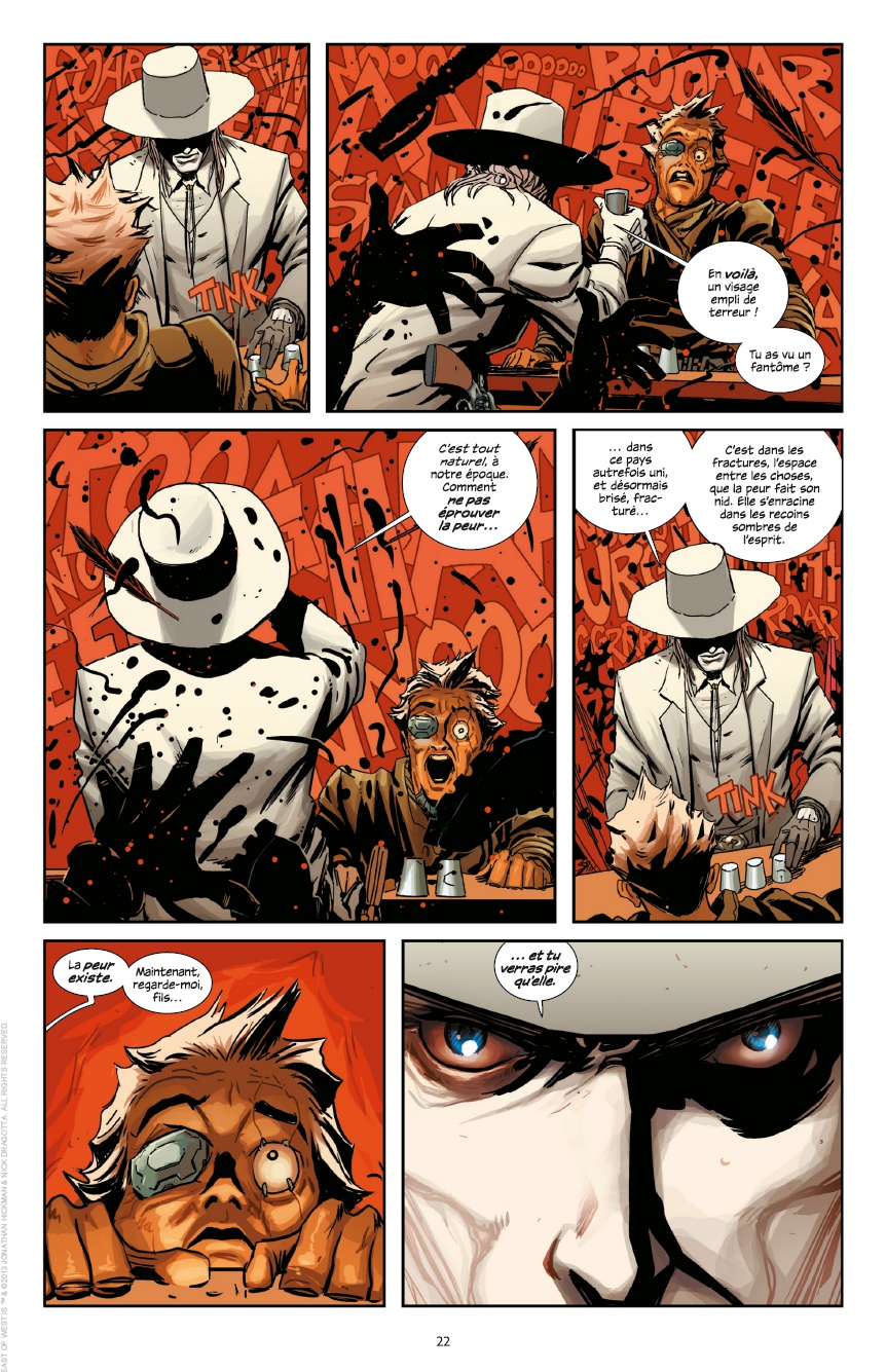 East of the West est une œuvre un peu mystique. C’est très original car cela part d’une uchronie qui va diviser les Etats-Unis en sept états différents dont le processus commencera au cours de la guerre de Sécession. Il est question d’une prophétie de fin de monde. Visiblement, les quatre cavaliers de l’apocalypse ne sont plus que trois car le quatrième s’est fait la malle avec des comptes à régler. Bref, il y a du western, du fantastique, de la science-fiction post-apocalyptique qui est mélangé. Au début, j’avais des doutes sur une la crédibilité d'une telle potion mais cela le fait au cours de la lecture. Le scénario se révèlera d’une richesse étonnante. On regrettera juste un graphisme assez épuré qui n’est pas tout à fait à la hauteur sans être totalement mauvais. Au final, c’est une série qui est originale et qui est bien évidemment à découvrir.Le 08/01/2018 à 11:00:57