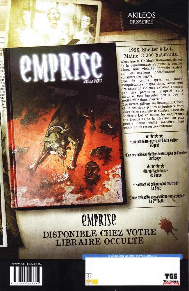 Info édition : Contient le récit complet Emprise : Motel 66, puis 6 pages de preview d'Emprise : Anamnesis et 5 pages de recherches graphiques. L'ISBN indiqué dans le fascicule (978-2-35574-334-4) correspond à un autre livre, celui déduit du code-barres semble plus juste.