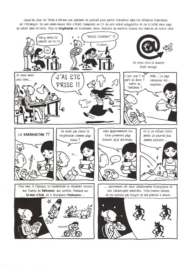 Encore un récit de globe-trotter à la manière du Guy Delisle. On va découvrir le Kazakhstan d'une certaine manière aux antipodes du récit de Ted Rall dans La Route de la soie... en lambeaux qui était beaucoup plus sérieux. Ici, on laisse tomber tout l'aspect économique et politique pour se plonger intimement dans une espèce de drame de couple. En effet, je découvre que deux Français en couple qui partent dans ce pays subissent l'effet Kazakhstan à savoir qu'ils se séparent car il y a de trop jolies filles là-bas. C'est primal et c'est une ode à l'infidélité même si l'auteur se perd dans une théorie dite scientifique pour expliquer ce phénomène. Chacun doit assumer ses choix, après tout. Ex-Patria nous emmène dans une région méconnue pour mieux se découvrir.BDGest 2014 - Tous droits réservés