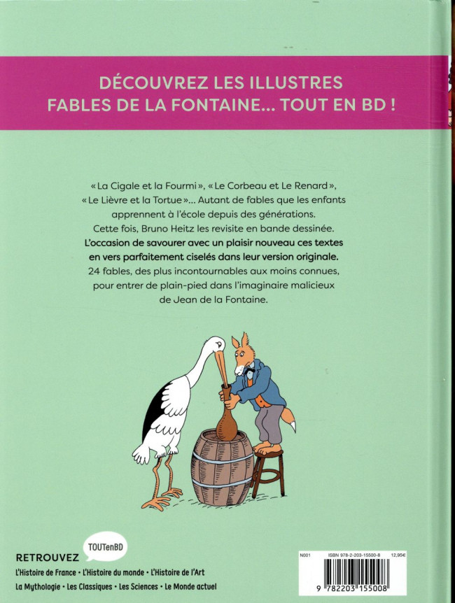 Cette bande dessinée réunit 24 fables de Jean de La Fontaine, choisies, scénarisées et dessinées par Bruno Heitz : Le corbeau et le renard, La cigale et la fourmi, Les animaux malades de la peste… et en découvrir d’autres comme Le héron, le rat et l’huître.