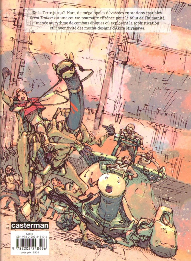 Résumé: Shin-Umeda, la communauté de survivants sur laquelle s'appuie l'institut Yao pour rebâtir la civilisation, est attaquée par les forces de l'Akaguma. Naoki et ses compagnons parviennent à repousser les assauts destructeurs des pillards, mais pour essuyer aussitôt une nouvelle attaque, menée cette fois par Elysium, la corporation multinationale martienne, prête à tout pour récupérer Hinako. De la Terre jusqu'à Mars, de mégalopoles dévastées en stations spatiales, Great Trailers est une course-poursuite effrénée pour le salut de l'humanité, menée au rythme de combats épiques où explosent la sophistication et l'inventivité des mecha-designs d'Akira Miyagawa.