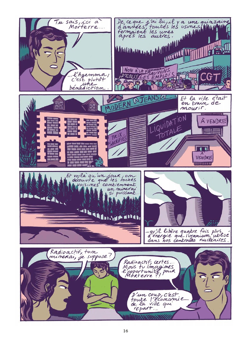 Résumé: Morterre est une petite ville industrielle terne et isolée, habitée majoritairement par les employés de l’Agemma, une entreprise d’extraction de minerais radioactifs. Jonas et Camille, deux adolescents de 17 ans, vivent depuis toujours dans cet endroit qu’ils rêvent de quitter. En attendant, ils patientent en regardant des nanards horrifiques surannés. Absorbés par leur propre passivité, ils ne prêtent pas attention à l’étrange disparition d’un employé de l’Agemma. Dans le même temps, une nouvelle élève débarque de Paris. Elle s’appelle Nour et n’a pas l’intention de croupir dans l’ennui. Elle pousse Jonas et Camille à explorer la ville et ses alentours. Au cours d’une excursion nocturne, ils découvrent ensemble un homme au visage malade, défiguré par de terribles excroissances. Cet homme, c’est l’employé disparu de l’Agemma. Que lui est-il arrivé ? Pourquoi reste-t-il caché ? Est-ce que l’Agemma est impliquée ?
