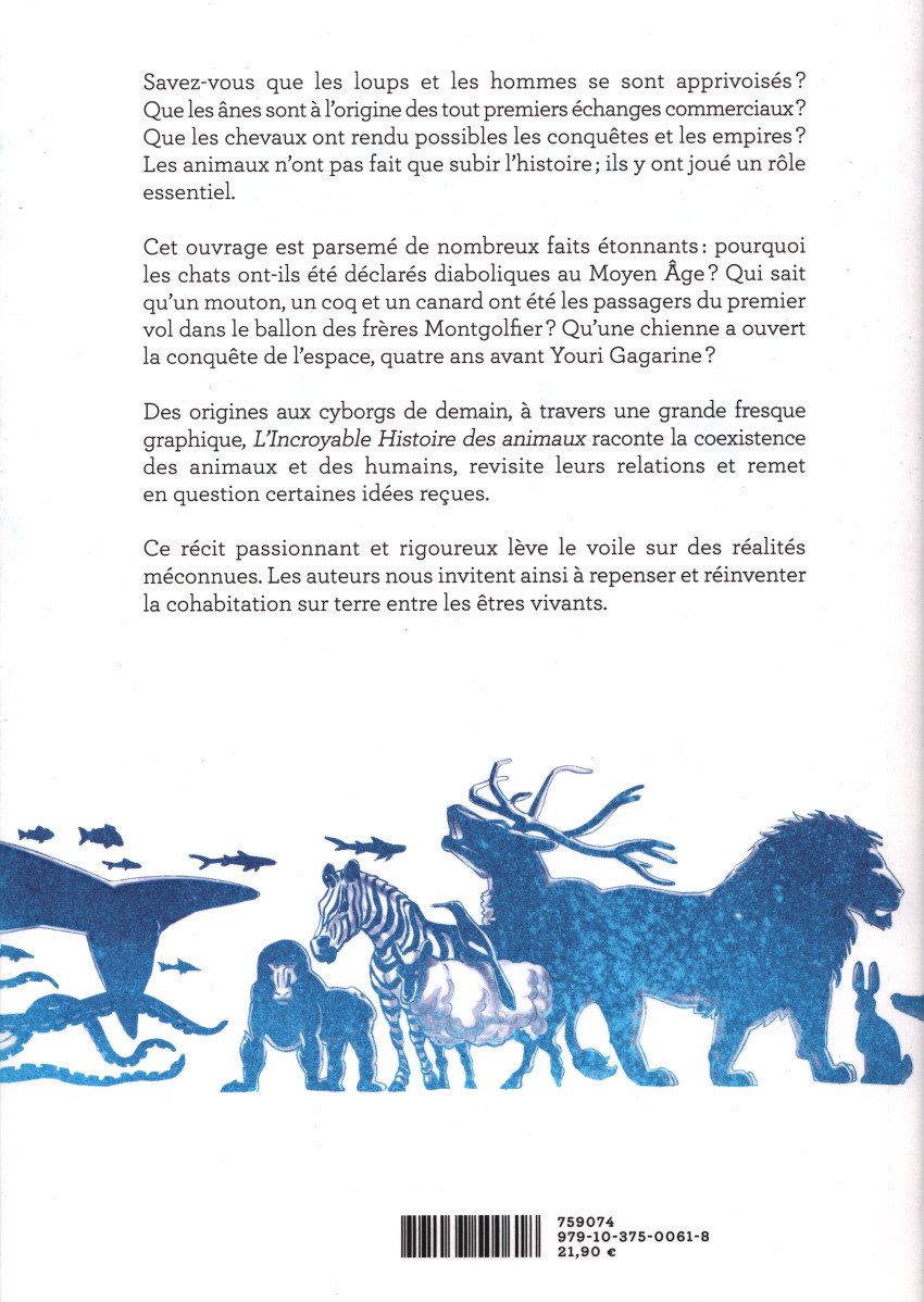 Résumé: Savez-vous que les loups et les hommes se sont apprivoisés ? Que les ânes sont à l'origine des premiers échanges commerciaux ? Que les chevaux ont rendu possibles les conquêtes et les empires ? Les animaux n'ont pas fait que subir l'histoire, ils y ont joué un rôle essentiel. Pourquoi les chats ont-ils été déclarés diaboliques au Moyen Âge ? Qui sait qu'un mouton, un coq et un canard ont été les passagers du premier vol dans le ballon des frères Montgolfier ? Qu'une chienne a ouvert la conquête de l'espace, quatre ans avant Youri Gagarine ? Des origines aux cyborgs de demain, la coexistence des animaux et des humains, leurs relations et la remise en question de certaines idées reçues !
