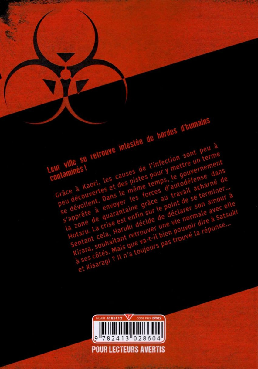 Résumé: Des lycéens jouent à s'enfermer en couple dans la réserve du gymnase. Quand le tour d'Haruki et Kirara se termine, personne ne vient les libérer. À leur sortie, ils découvrent l'horreur. Les morts reviennent à la vie et mordent les vivants pour les infecter. Pour éviter la pandémie, le gouvernement coupe la ville de l'extérieur. Haruki et un groupe d'élèves vont tout tenter pour s'en sortir.