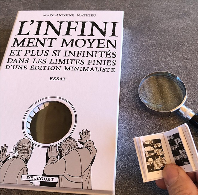 Si vous ne connaissez pas Marc-Antoine Mathieu, bienvenue dans un monde expérimental, un monde où tout contournement du format BD est exigé, où les réflexions sur la forme et le fond sont permanentes et aboutissent sans doute au projet le plus extrême de l’auteur. L’ouvrage absurde au titre à rallonge est ainsi tout simplement la plus petite BD du monde, littéralement de la taille d’une phalange, vendu avec une loupe afin de pouvoir lire les 88 pages de l’album. Passé le carton rouge à Delcourt pour l’impression en chine et le prix tout de même dissuasif pour un objet si expérimental (plus de vingt euros), on constate que l’on a affaire à un vrai album qui navigues entre le jeu de langue de Raymond Devos et les circonvolutions philosophiques sur l’infini et la finitude. Il faut reconnaître que graphiquement, si l’auteur aime toujours jouer sur l’enchevêtrement des plans et des cases, utilisant zoom et dézoom avec une facétie ludique, la qualité du dessin laisse à désirer. A se demander si l’auteur n’a pas travaillé sur le format d’impression, ce qui serait un nouveau tour de force. Toujours est-il qu’une centaine de pages noir et blanc de débats surréalistes entre deux scientifiques voyageant dans les dimensions de l’infini et des pages ça fait quand même beaucoup pour un cerveau de lecteur BD. Une fois passé l’amusement formel, pas sur que vous lisiez l’intégralité de l' »histoire ». Mathieu a fait mieux visuellement parlant. On pourra néanmoins savourer de vraies interrogations philosophiques qui débordent la diarrhée verbale dans laquelle les personnages sont conscients de se vautrer (la mise en abyme est une constante chez l’auteur). Projet aussi absurde qu’intéressant, ne trompant personne sur la marchandise (il est indiqué « Essai » sur la boite qui accompagne le livre), L’infiniment moyen… est bien entendu un OBNI qui fera date par la folie du projet plus que par son contenu. Et bon courage pour le ranger… Lire sur le blog: https://etagereimaginaire.wordpress.com/2025/10/23/linfiniment-moyen-et-plus-si-infinites-dans-les-limites-finies-dune-edition-minimaliste/Le 14/10/2025 à 14:34:35