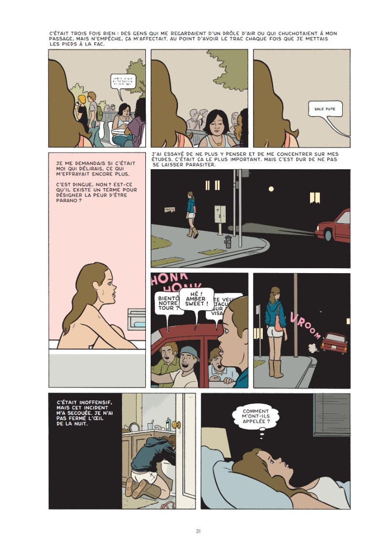 Cornélius n'est pas le type d'éditeur que je suis. Proche de l'Association et du Requin Marteau, ce petit éditeur édite des BD d'auteurs alternatifs avec une ligne graphique de contraintes chromatiques qu'illustre très bien Les intrus. Très attaché au dessin, ce style (qu'on peut retrouver chez Shiga, Trondheim, Crumb, Blutch,...) m'attire généralement peu, mais le trait de Tomine sur certaines sections, proches de la ligne claire ou des dessins plats que peut utiliser un Adam Hughes m'ont donné envie de le découvrir. Cet album a été emprunté en médiathèque. Il a été sélectionné au festival d'Angoulême, il s'agit du septième recueil publié en France. Tomine est dessinateur de presse et édite un magazine BD, Optic Nerve, donc sont issues les histoires publiées par Cornelius. Adrian Tomine nous propose six histoires sur les vies médiocres d'américains moyens, tantôt aspirant à un destin d'artiste, tantôt perdus dans un couple mal assorti... Des tranches de vie dépressives sur l'Amérique d'aujourd'hui. La couverture de ce recueil m'a beaucoup plu avec un design élégant reflétant un peu l'esprit sérigraphie. Le style des six histoires est très différent, entre une première aux textures tramées, celle en quasi noir-et blanc et l'histoire de l'humoriste en gaufrier au dessin d'un trait fin et élégant. Ce qui est certain c'est que le nipo-américain a une vraie facilité de trait et que son dessin est fort maîtrisé, malgré les séquences minimalistes qui empruntent (surtout pour la première histoire du jardinier, la plus drôle) au strip de presse avec des successions de séquences fixes en peu de vignettes. Si cette variété des styles peut déconcerter, elle permet de découvrir les palettes d'un auteur représentatif d'une école graphique et artistique loin des blockbusters du Big Two ou même des comics indépendants made in Image. J'avoue que le traitement des sujets m'a en revanche un peu déprimé. L'auteur nous propose des vies médiocres, de personnes en difficulté relationnelle, professionnelle, sociale et à l'opposé de l'idéal américain de personnes qui se remontent les manches et réussissent par l'effort. De l'effort il y en a avec le jardinier, la jeune Stand-upeuse qui se donnent les moyens de réussir leur passion et parfois même sont soutenus par leur famille. Mais inlassablement ils échouent tout simplement car ils sont mauvais, médiocres, s'enfoncent dans les mauvais choix. Une vision très triste de l'humanité qui me plaît que moyennement. L'histoire la plus intéressante est celle de cette étudiante dont la vie bascule lorsqu'elle réalise qu'elle est le sosie d'une star du web X... Sans aucune prise sur ce que pensent les gens d'elle elle comprend que toutes les relations qu'elle entreprendra seront issues de sa ressemblance. Une prédestination très dure mais la jeune fille fait ce qu'il faut pour se sortir de cette situation, jusqu'à rencontrer la personne à l'origine de ses problèmes. Une belle histoire sur les relations humaines d'où sort du positif. Tomine parle aussi de lui, au travers de cet étonnant récit du voyage de sa mère du Japon vers les Etats-Unis vu à la première personne, permettant des sortes de Haïkus graphiques... Cet album n'est pas destiné à tout public mais permettra aux curieux de connaître les différentes formes de BD et notamment aux amateurs de strip de découvrir un auteur très représentatif du milieu culturel et intellectuel américain d'aujourd'hui. Lire sur le blog: https://etagereimaginaire.wordpress.com/2019/07/31/les-intrusLe 14/07/2016 à 12:21:24