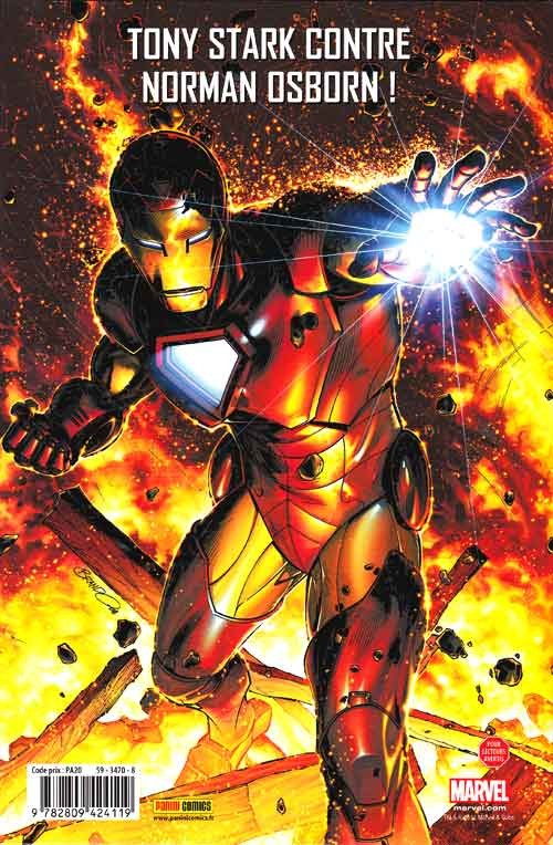 Début du très long run sur Iron Man par Matt Fraction et Salvador Larroca qui s’étalera sur près de 50 numéros entre 2008 et 2012 (The Invincible Iron Man 2008, #1-14). Dans un scénario qui rappelle celui du film Iron Man 3 sorti en 2013 – le Mandarin arrivera plus tard –, la première intrigue débute comme une histoire de terrorisme technologique pour finir par une vengeance personnelle d’Ezekiel Stane contre Tony Stark. L’intrigue progresse à un rythme modéré, on découvre autant Iron Man que son adversaire et on commence à s’intéresser à Pepper Potts et à sa peur du transhumanisme. Le seul bémol finalement c’est d’avoir conclut par le trop classique affrontement armure contre armure, il y aurait eu plus original à imaginer. Après un intermède façon team-up entre Iron Man et Spider-Man, la seconde histoire est estampillée "Dark Reign", du nom de la période qui a suivi l’event Secret Invasion. On y suit Tony Stark banni de sa propre entreprise, dépossédé de ses armures – enfin il lui en reste toujours quelques-unes – et recherché par H.A.M.M.E.R., l’agence remplaçant temporairement le S.H.I.E.L.D. sous la coupe de Norman Osborn. Il est assez intéressant de voir Iron Man dans une position inconfortable et les rôles de premier plan laissés à Pepper Potts et Maria Hill amènent un peu de fraicheur. Par contre, on aurait pu se passer de ces combats inutiles successifs (contre War Machine, Namor ou le Contrôleur...). Un mot sur le dessin : Salvador Larroca a un style hyperréaliste à un point tel que cela en devient perturbant, notamment sur les visages ; de plus, la colorisation abuse des effets de reflets et les visages virent souvent au marron orangé comme si tous les personnages avaient forcé sur les séances d’UV...BDGest 2014 - Tous droits réservés