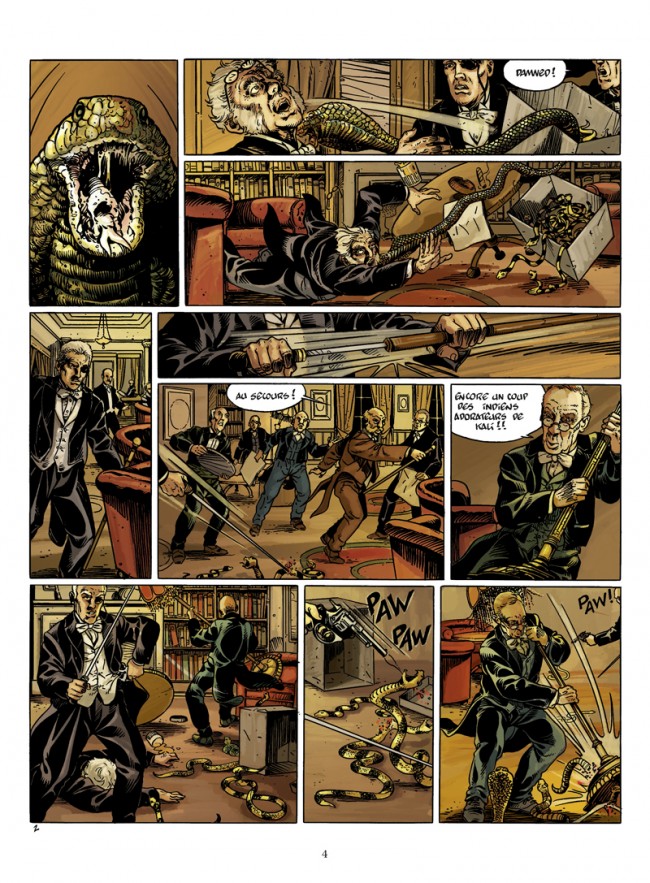Jean-Marc Stalner (Fabien M, Le cercle de Minsk) est particulièrement à l’aise dans la description de la Troisième République et, pour les passages Outre-Manche, de l’ambiance victorienne. Sans doute conscient du manque de mouvement de ses personnages – très figés par moment –, le dessinateur choisit, avec beaucoup d’intelligence, de décomposer les actions. Cette « astuce », associée à des cadrages très serrés, permet de donner beaucoup d’impact aux scènes d’action. Le dessin, très classique, reste toujours très lisible. La mise en couleur d’Elvire de Cock, quoiqu’un peu lourde par moment, est néanmoins efficace.