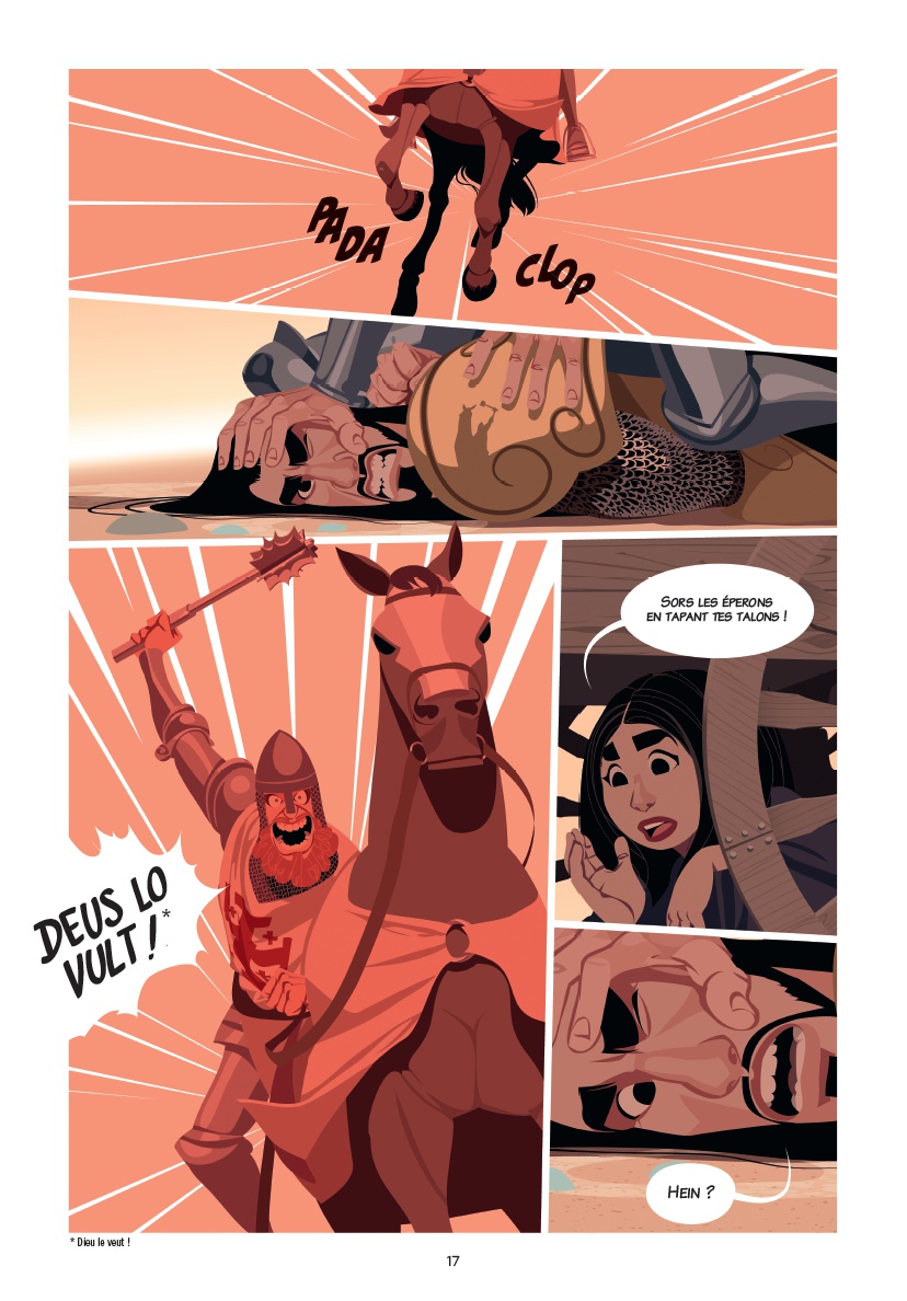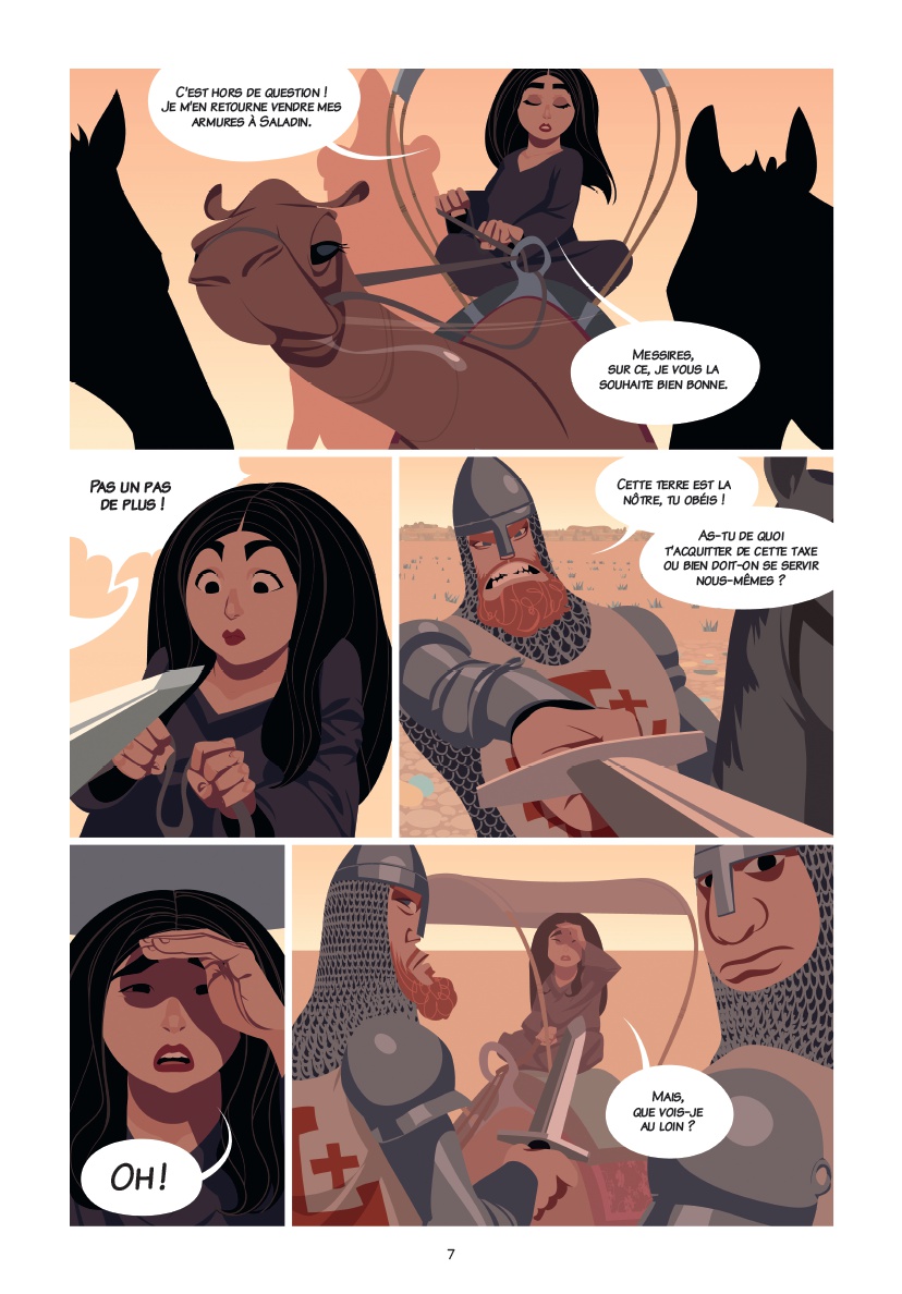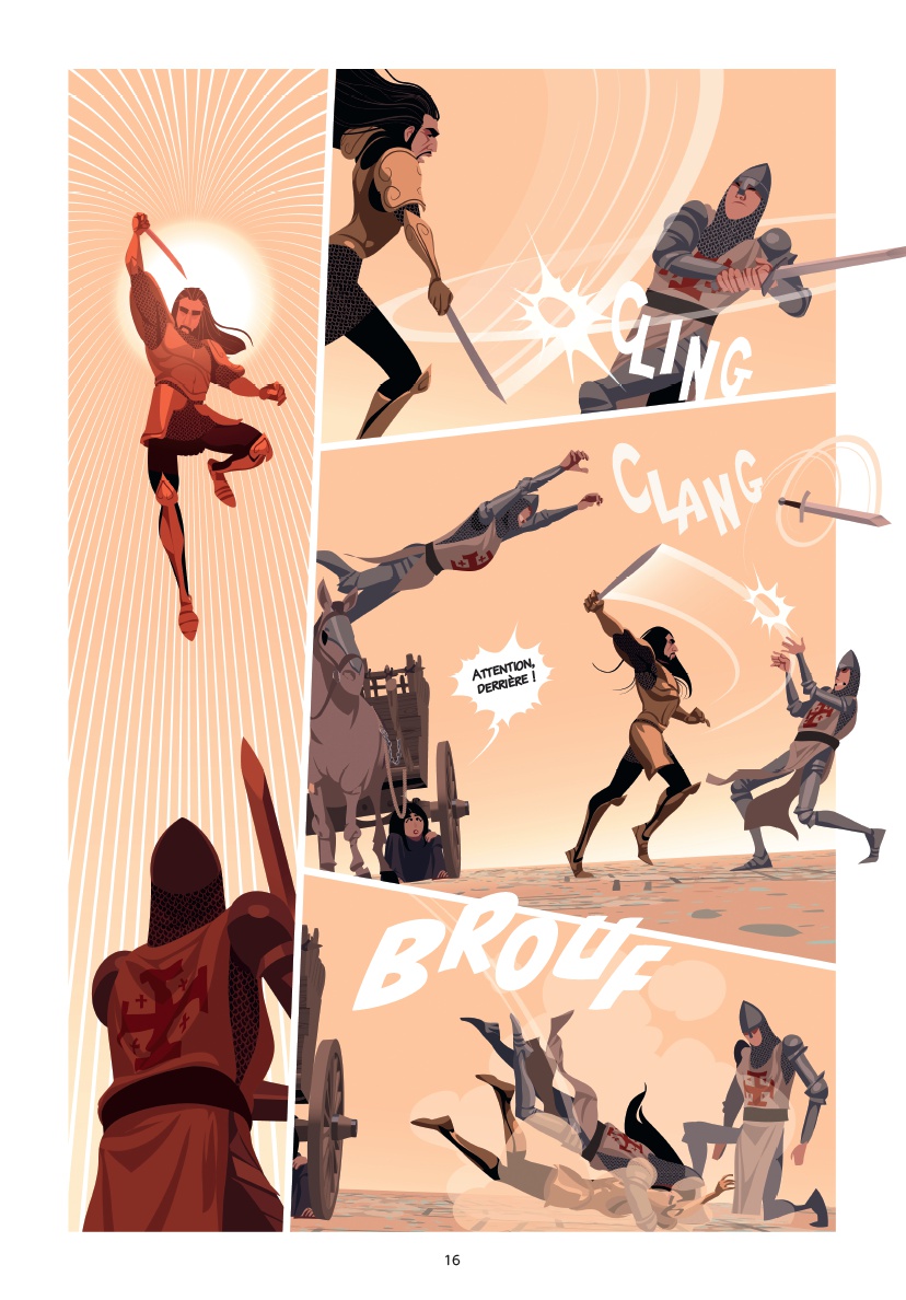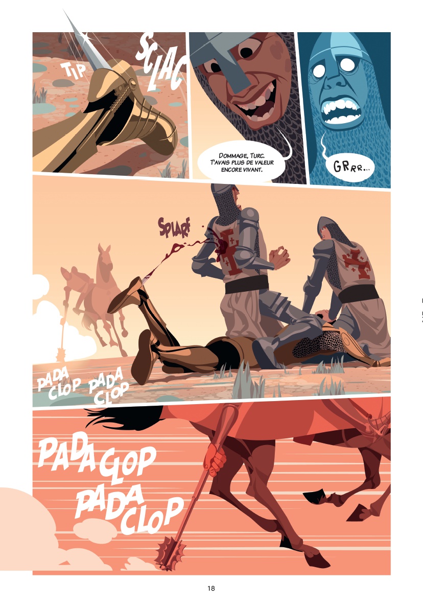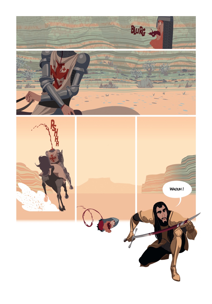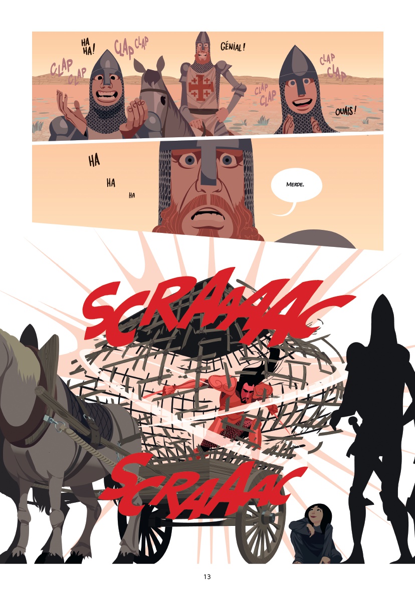 Évidemment, l'auteur ne se contente pas de transposer le classique d'Akira Kurosawa au temps des Croisades. Il construit une intrigue rapidement prenante en s'appuyant sur des personnages forts dont les caractères vont créer des étincelles. Que les fans se rassurent, ils ne devraient pas être désarçonnés tant le style Arthur de Pins est reconnaissable entre mille et son humour, caustique, bien présent. Il repose en grand partie sur les dialogues. À la manière de Kaamelott, la création multiformat d'Alexandre Astier, l'auteur opte pour un champ lexical actuel pour écrire des échanges drôles et des répliques cinglantes. En parallèle, il prend un malin plaisir à moquer les extrémistes, leurs bassesses, leur bêtise. Mais loin de se cantonner à ce qu'il maitrise, il explore également de nouveaux horizons.