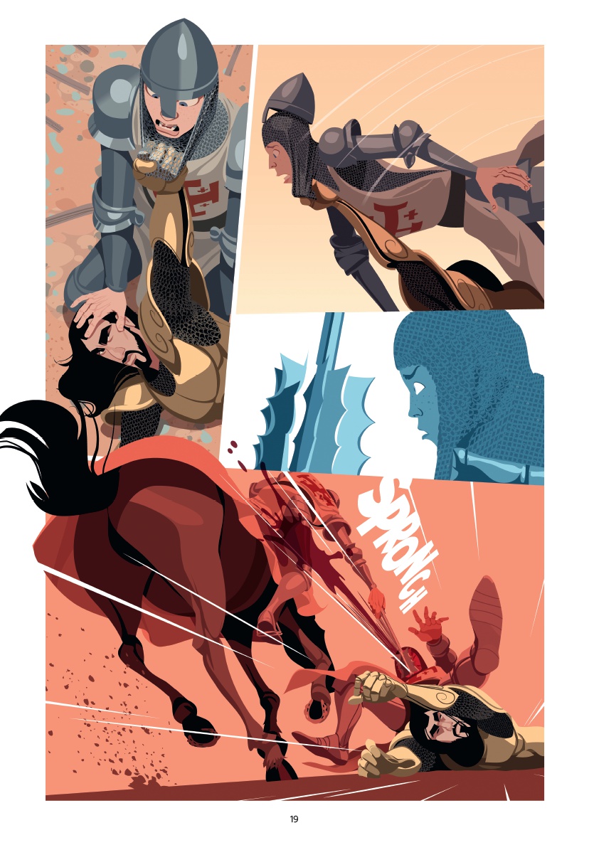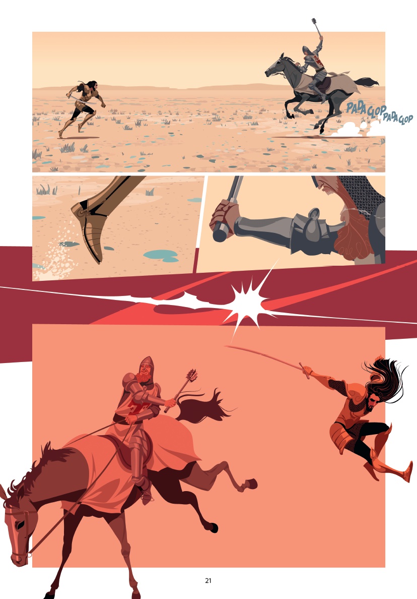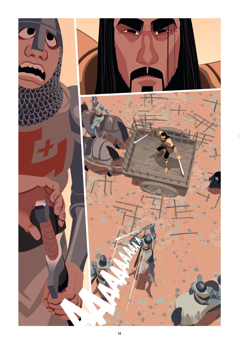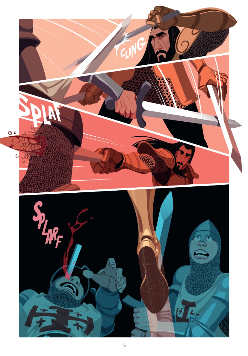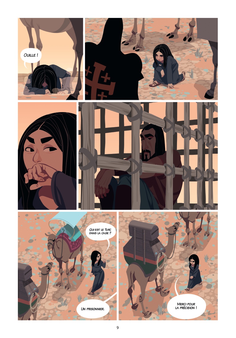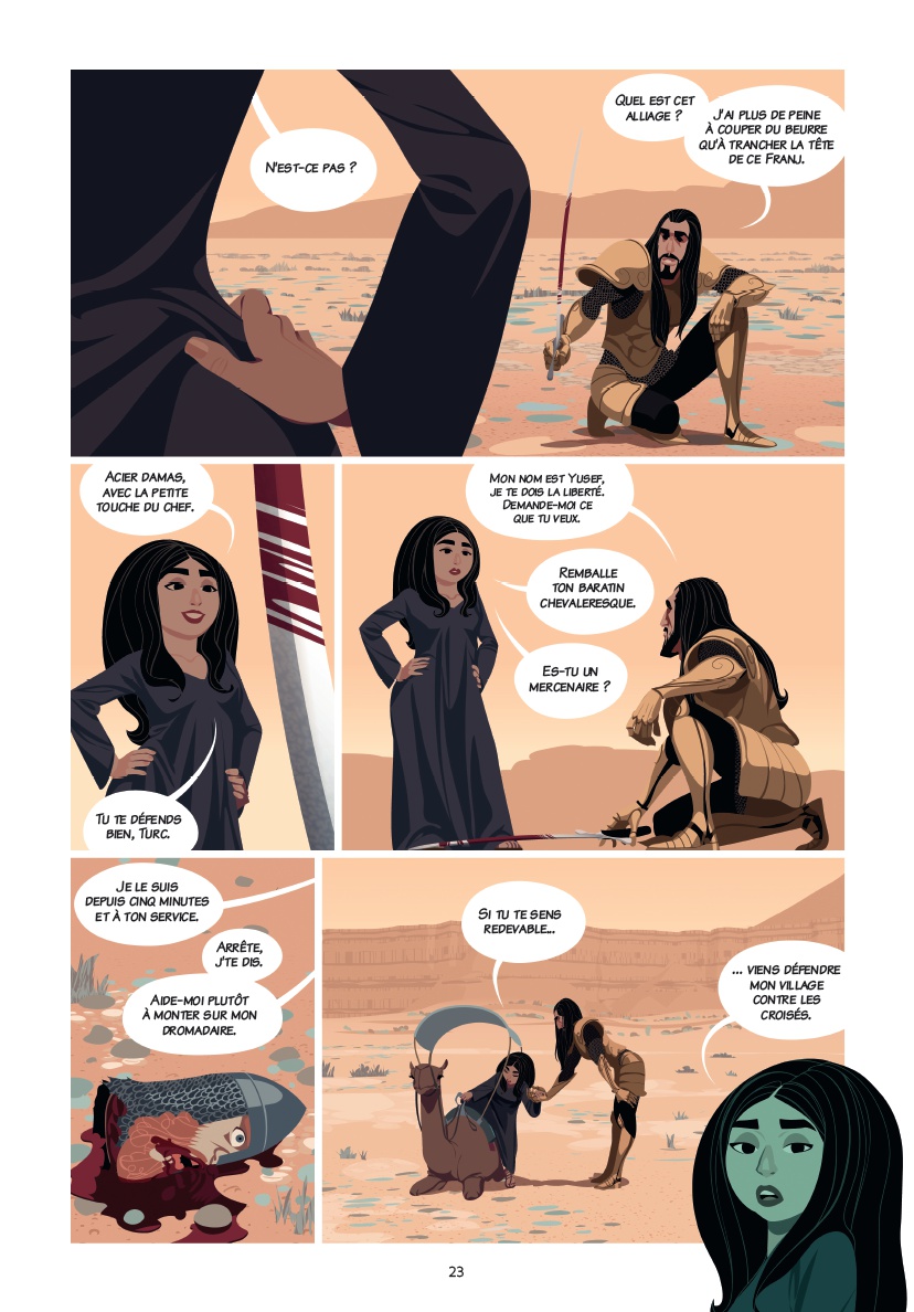 Évidemment, l'auteur ne se contente pas de transposer le classique d'Akira Kurosawa au temps des Croisades. Il construit une intrigue rapidement prenante en s'appuyant sur des personnages forts dont les caractères vont créer des étincelles. Que les fans se rassurent, ils ne devraient pas être désarçonnés tant le style Arthur de Pins est reconnaissable entre mille et son humour, caustique, bien présent. Il repose en grand partie sur les dialogues. À la manière de Kaamelott, la création multiformat d'Alexandre Astier, l'auteur opte pour un champ lexical actuel pour écrire des échanges drôles et des répliques cinglantes. En parallèle, il prend un malin plaisir à moquer les extrémistes, leurs bassesses, leur bêtise. Mais loin de se cantonner à ce qu'il maitrise, il explore également de nouveaux horizons.