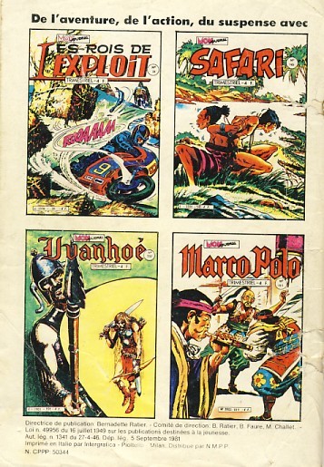 Info édition : Lancelot : "Au péril de la mer" par Jean Ollivier (sc) et Santo D'Amico (des) (45 pl) - Diavolo : Un journaliste ne ment jamais par Mario Sbattella (sc et des) (15 pl) - Barnabé : Ce cher vieux Barnabé par Juan Rafart (des) (4 pl) - Bingo : Le nuage bleu (50 pl).