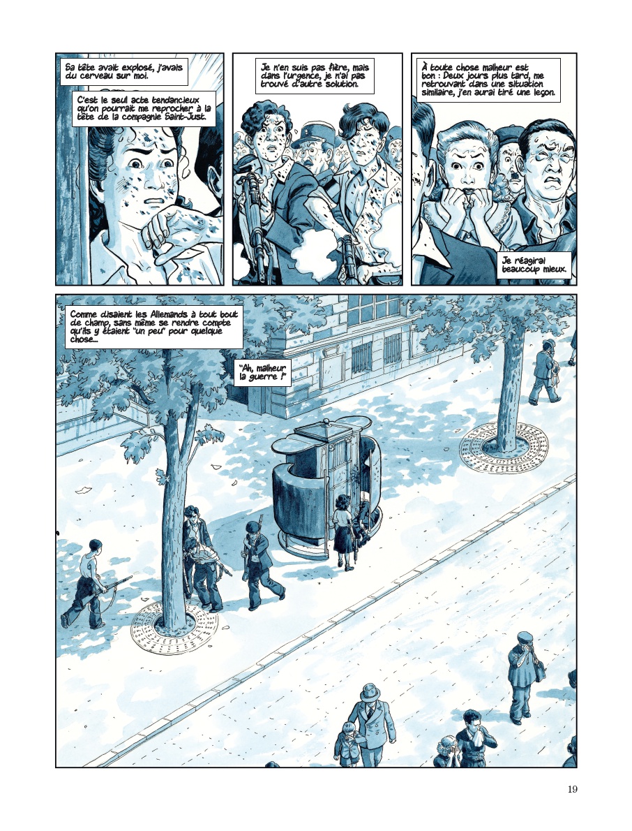 C’est superbe ! Voilà ce que la bande dessinée, en tant que média, peut offrir de meilleur : 4 albums d’une profonde beauté, que l’on dévore littéralement, tant le récit est intense et captivant. Mais aussi une œuvre chargée de mémoire, qui transmet à la fois l’horreur quotidienne de la guerre et l’enfer de la Résistance. Car oui, si les résistants sont perçus comme des héros, des libérateurs, on oublie souvent leurs souffrances, la perte des compagnons, la carapace de détermination sous laquelle ils ont dû enfouir leurs vulnérabilités, les actions moralement discutables dont ils ont eu à endosser la responsabilité… En un mot, le prix que toutes et tous ont payé pour la liberté. C’est ce que montre avec puissance et gravité « L’ange exterminateur », l’épisode le plus sombre de la série. Reconquérant Paris rue par rue, au plus près du danger, hantée par ses combats, Madeleine montre un courage à toute épreuve. Forgée pour survivre, elle n’est plus que force et volonté. Pourtant, alors que la victoire se rapproche, elle reste hermétique à la liesse ambiante, brisée par la violence et la mort. Et c’est peut-être le plus touchant. Après une reconstruction qu’on imagine douloureuse, une nouvelle vie d’aventure et de défis s’amorcera pour elle. Ce qui fera, on l'espère, l’objet d’un nouveau cycle. En attendant, 1000 bravos à Jean-David Morvan d’avoir si bien su transcrire les souvenirs de Madeleine Riffaud, alias Rainer, une gamine d’à peine 20 ans à la Libération, qui nous assène par-delà le temps une bouleversante leçon de vie. Son exemple ne peut nous inspirer qu’humilité et hauteur de vue. Et bravo à Dominique Bertail d’avoir si bien su traduire en image, et jusque dans ses moindres détails, la réalité d’une époque que sa palette bleutée rend inoubliable. Bravo encore d’avoir si bien su portraiturer ses acteurs, héros ou salauds. Bravo enfin d’avoir laissé la lumière irriguer ses planches, sans jamais chercher à dramatiser artificiellement le théâtre des évènements. Ils signent tous deux avec « Madeleine, résistante » une œuvre capitale de la bande dessinée.Le 06/11/2025 à 11:14:57
