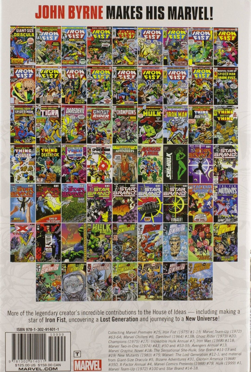 Info édition : Collects Marvel Premiere (1972-1981) #25; Iron Fist (1975-1977 1st Series) #1-15; Marvel Team-Up (1972-1985 1st Series) #63-64 and #100 (B STORY); Marvel Chillers (1975) #6; Daredevil (1964-1998 1st Series) #138; Ghost Rider (1973-1983 1st Series) #20; Champions (1975-1978 Marvel) #17; Incredible Hulk (1962-1999 1st Series) Annual #7; Iron Man (1968-1996 1st Series) #118; Marvel Two-in-One (1974-1983 1st Series) #43, 50 and 53-55; Avengers (1963-1996 1st Series) Annual #13; Sensational She-Hulk GN (1985 Marvel); Star Brand (1986-1988) #11-13, 19 and (the A Stories from) #14-18; New Mutants (1983-1991 1st Series) #75; Marvel: The Lost Generation (2000-2001) #1-12; and material from Giant Size Dracula (1974) #5, Bizarre Adventures (1981 Magazine) #31, Captain America (1968-1996 1st Series) #350, X-Factor (1986-1998 1st Series) Annual #4, Marvel Comics Presents (1988-1995) #79 and Incredible Hulk (1999-2008 2nd Series) #1.