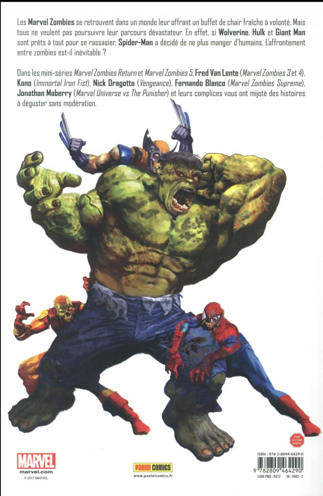Résumé: Nos héros zombifiés se retrouvent dans un monde leur offrant un buffet de chair fraîche à volonté. Mais tous les Marvel Zombies ne veulent pas poursuivre leurs parcours dévastateur. En effet, si Wolverine, Hulk, Iron Man et les Avengers survivants sont prêts à tout pour se rassasier, Spider-Man a décidé de ne plus manger d'humains !