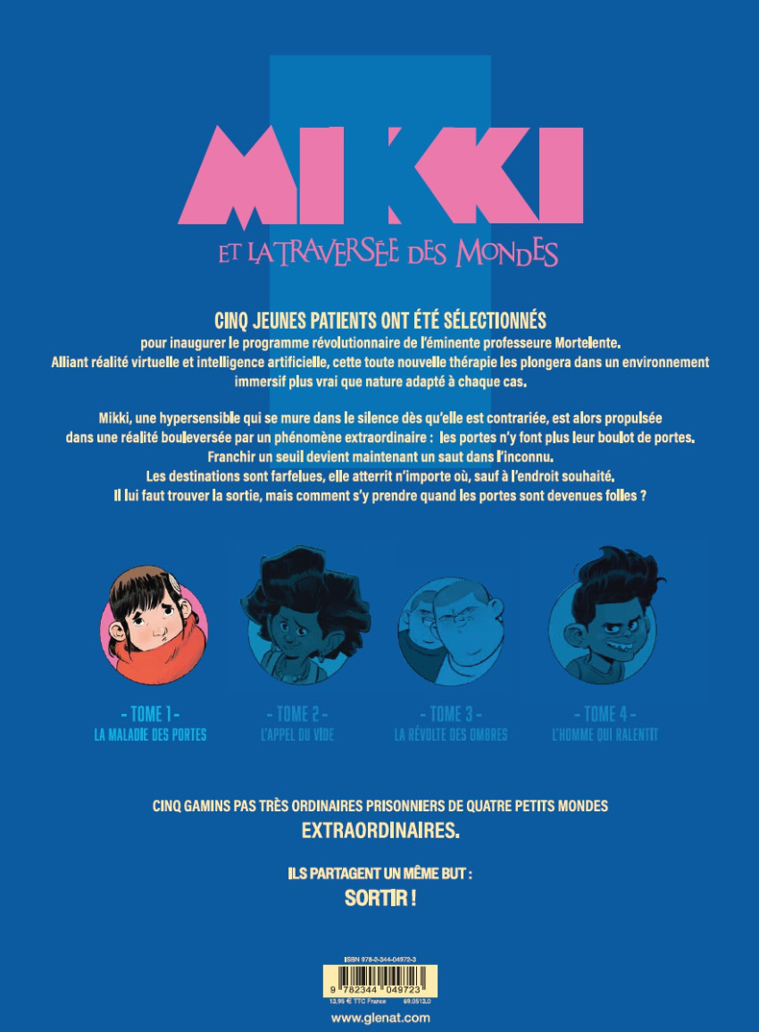 Mikki souffre d’une timidité maladive. Avec quatre autres enfants atteints eux aussi de troubles du comportement, elle participe à un nouveau programme révolutionnaire : le Protocole Mortelente. Cette thérapie originale fait appel à la réalité virtuelle et à l’intelligence artificielle. Le Protocole crée des jeux d’aventures immersifs sur-mesure pour permettre à chaque enfant de dépasser ses peurs. Pour les parents, c’est la promesse d’une guérison miraculeuse, garantie 100 % sans risques… Le parcours de Mikki s’avère déconcertant : après chaque épreuve, elle franchit une porte et se retrouve aussitôt projetée dans un tout autre univers. Porte après porte, des personnages se joignent à elle : super-héros des Cavernes, un jeune explorateur loufoque, une petite fille sans peur et son grand frère poltron, et même une hyène fluorescente particulièrement soupe au lait. Muette et craintive au début, Mikki va aller loin, trop loin en franchissant une énième porte dont l’accès est interdit… Ce sera le début d’une sacrée pagaille qui va mettre en danger tous les autres participants !