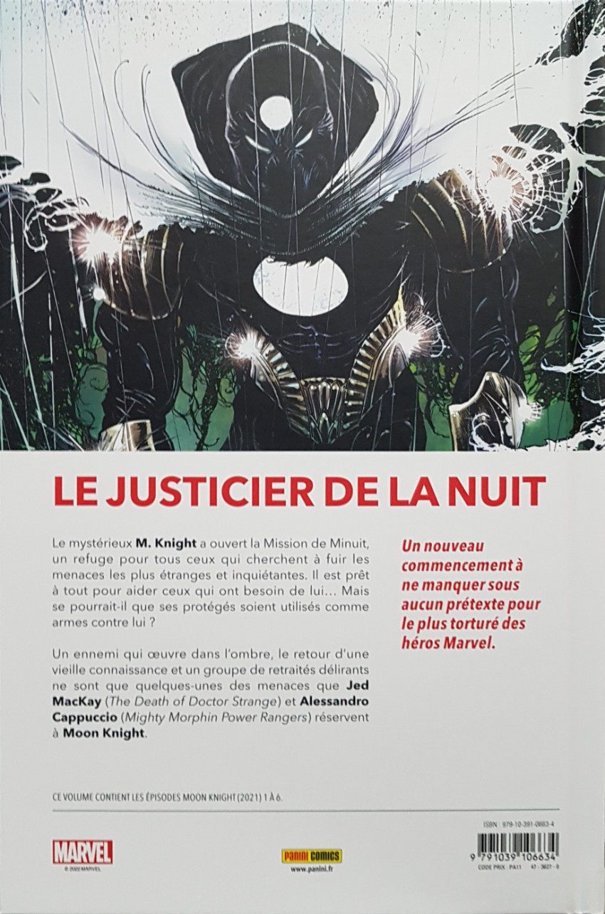 Résumé: Moon Knight s'est libéré de ses liens avec le dieu Khonshu. Au travers de la Mission de Minuit, il continue de protéger les gens de la nuit. Mais que se passe-t-il quand ceux qu'il défend deviennent des armes et se retournent contre lui ? Qui est derrière les étranges gangs de vieillards qui sèment la violence sur leur passage ? Le héros nocturne a récemment traversé bien des épreuves, notamment en affrontant les Avengers à lui tout seul !