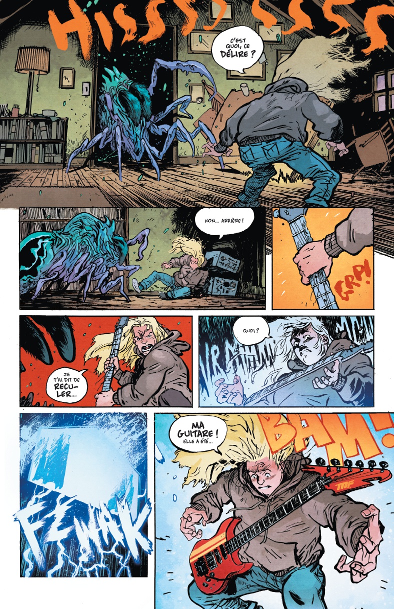N’étant pas Metal, ni Death, ni Hard, ni rien du tout, j’avoue avoir découvert cet album (le troisième de Daniel Warren Johnson) dans la peau d’un entomologiste amusé. Je grille pour l’occasion la priorité à notre spécialiste de DWJ, Dahaka qui voue un amour irraisonné pour cet attachant auteur indé…. Sortie il il y a huit ans (en 2020 chez nous), cette mini-série a ouvert les portes du prestigieux Black Label à l’auteur et Delcourt surf sur la nouvelle notoriété de l’artiste, auréolé d’un Eisner pour Do a power bomb et embarqué sur le populaire Energon Universe, pour ressortir l’album. DWJ est un américain, un vrai, influencé par des années 1980 qu’il n’a pas connu, une sorte de grand gamin qui s’éclate à la guitare, à regarder du Catch, à jouer avec ses bonhommes Transformers et à écouter des K7 audio sur un vieux waklman. Il n’est alors pas surprenant de trouver dans Murder Falcon une atmosphère à la Stranger Things. Pourtant, en vérifiant la chronologie on réalise que la BD est sortie avant la saison 4 de la série star de Netflix et l’arrivée de l’iconique Eddie Munson, l’iconique rôliste métalleux. Paru chez Skybound, la compagnie de Robert Kirkman, grand manitou des comics nostalgiques des jouets et esprit 80’s, dont l’actuel Energon univers, Murder Falcon ne trompe pas sur la marchandise: des monstres et du Métal! L’idée WTF est originale et efficace, en transposant le thème de l’équipe de super-héros en un groupe de Hard convoquant des esprit du Métal par l’puissance et la sincérité de leur jeu. Très à l’aise dans les séquences d’action, DWJ insuffle une énergie à ses planches qui gardent un rythme soutenu dans ce combat de la Terre contre ces monstres franchissant un portail ouvert par la peur. Résolument post-apo, le récit reste sombre par bien des aspects, l’auteur ne refusant aucun drame pour nous embarquer dans son odyssée bruyante. Que l’on soit perméable à l’esprit du métal ou non, il est indéniable que l’univers fantastique inventé pour l’occasion est riche et guère plus absurde que mille autres récits de faille entre les mondes. Comme des Power Rangers, chaque membre du groupe est ainsi accompagné d’une créature puissants qui affronte de véritables Kaiju (DWJ assume l’aspect patchwork en insérant sans aucune autocensure tout ce qui lui fait envie, jusqu’au porte-avion bardé de Boomers…). Un brin linéaire, l’intrigue si elle ne nous surprend pas nous embarque pourtant avec l’énergie de la passion et des designs très réussis qui montrent que sous un aspect quelque peu fruste, le trait de DWJ est très précis et nous emmène où il veut. Dans ce joyeux bordel on a très envie de mettre du gros son et d’aller découvrir le reste de sa biblio. Lire sur le blog: https://etagereimaginaire.wordpress.com/2025/09/23/murder-falcon/Le 29/09/2023 à 13:22:12