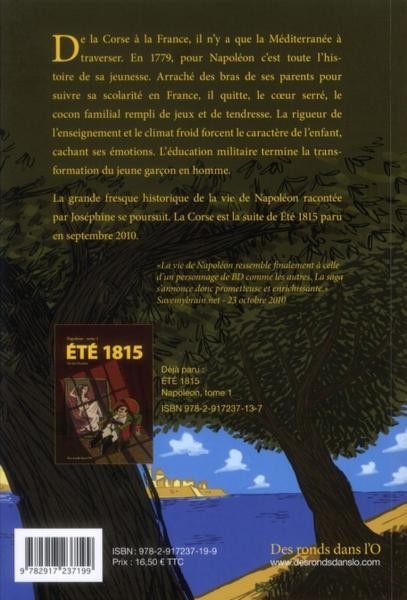 Résumé: La jeunesse de Napoléon en Corse. Après avoir commencé l'histoire par la fin, avec un premier tome qui raconte l'exil de Napoléon à Sainte Hélène et son décès, l'auteur reprend le cours de l'histoire et montre l'éducation rigoureuse que reçoit Napoléon, le poussant à devenir le futur dictateur que l'on connait. Le jeune homme se voit obligé de quitter la Corse, arraché des bras de sa mère et des jeux d'enfants avec ses frères et sœurs, et en est très affecté. Arrivé en France il est confronté à l'école qui petit à petit va le former à l'art de la guerre.
