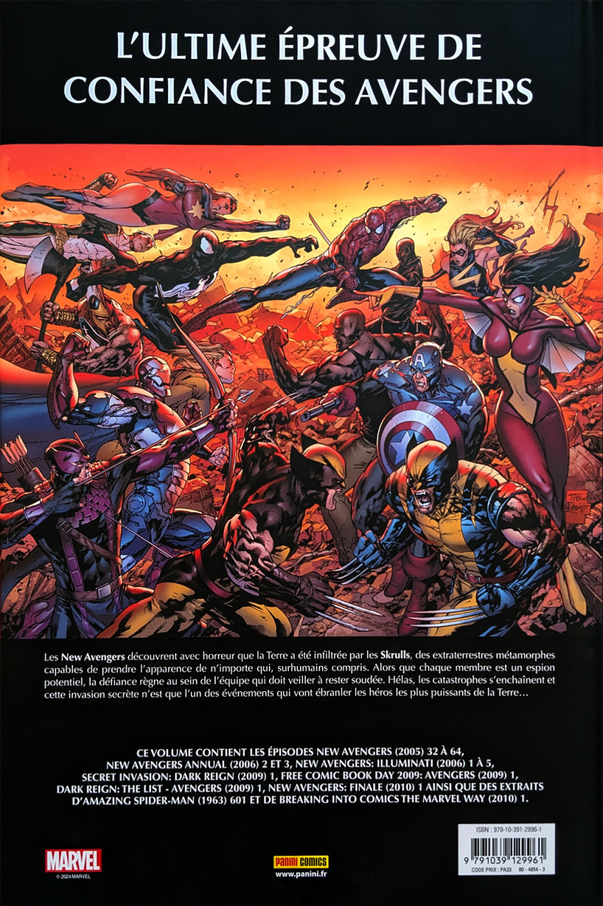 Info édition : Contient les épisodes US : New Avengers (2005) #32-64, New Avengers Annual (2006) #2-3, New Avengers: Illuminati (2006) #1-5, Secret Invasion: Dark Reign (2009) 1, Free Comics Book Day 2009: Avengers (2009 #1, Dark Reign: The List – Avengers (2009) #1, New Avengers: Finale (2010) #1, ainsi que des extraits d’Amazing Spider-Man (1963) #601 et de Breaking Into Comics The Marvel Way (2010) #1. En fin d'album, bonus de 16 pages (dessins de couvertures, couvertures variantes, études de personnages)