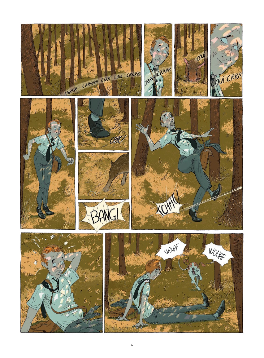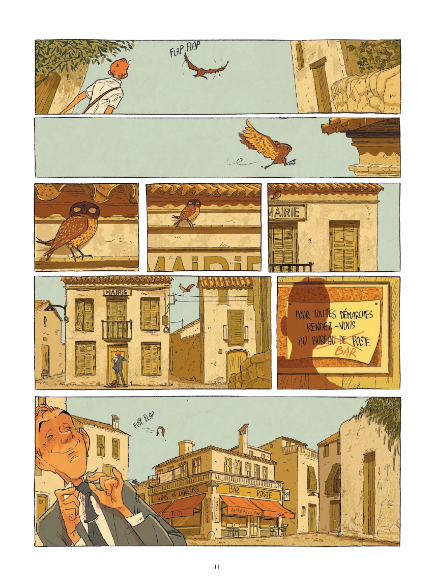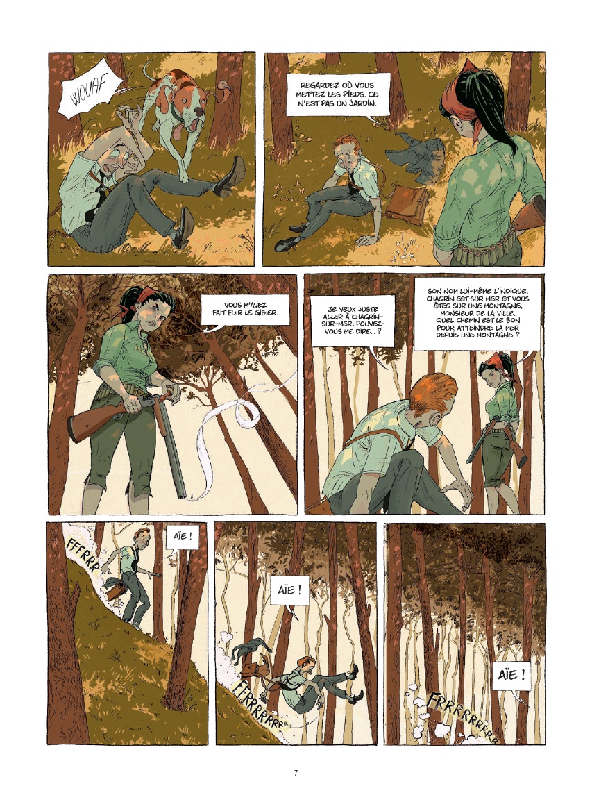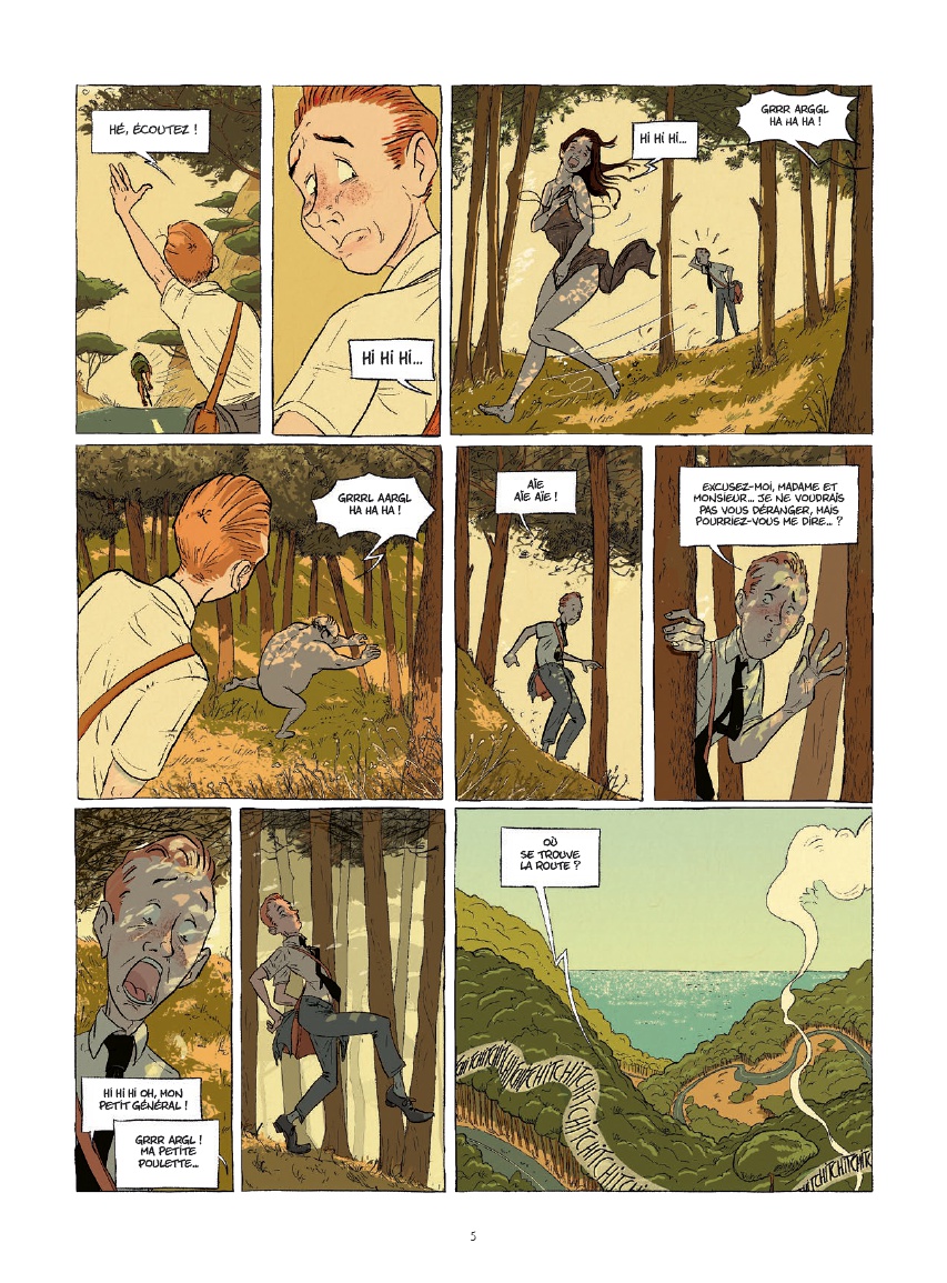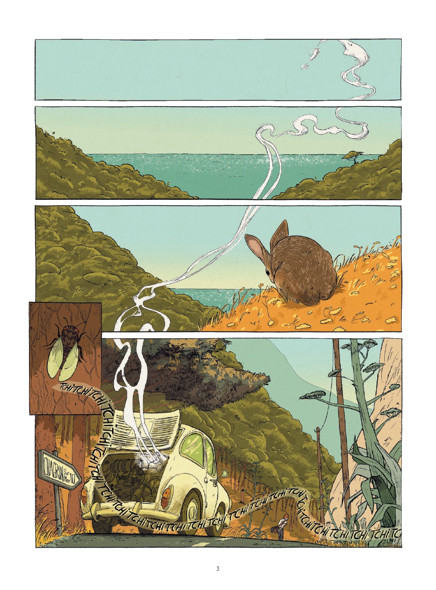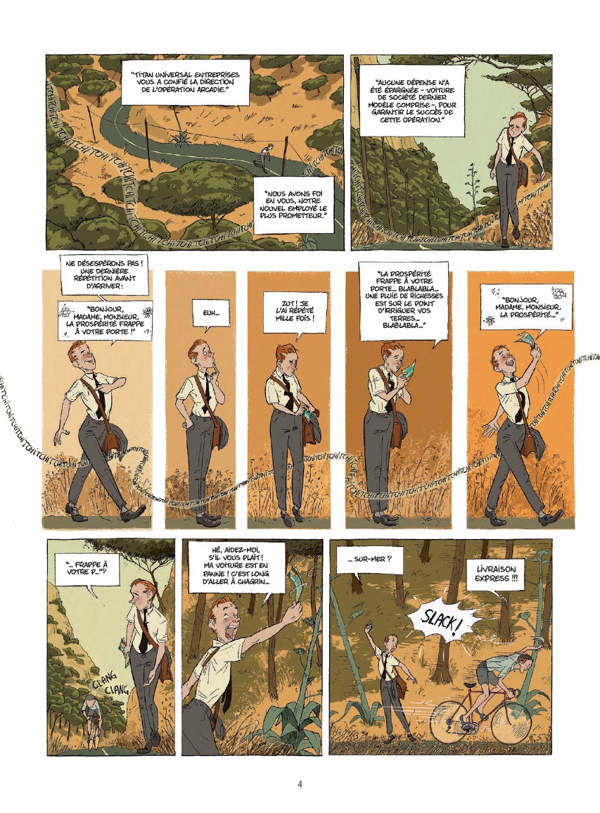 Écrit et dessiné par Juanjo Rodriguez J., le récit s’ouvre sur une scène qui installe immédiatement l’atmosphère du livre. Sur une route forestière, loin du rivage, la voiture du jeune cadre tombe en panne. Contraint de poursuivre son chemin à pied, il répète son argumentaire tout en croisant une série de personnages inattendus : un messager à vélo qui lui dérobe un dépliant, un molosse avec sa maitresse peu engageants ou encore un couple qui se poursuit en riant. Cette entrée en matière donne déjà le ton d’un ouvrage où le décalage et l’étrangeté s’invitent discrètement dans le quotidien.