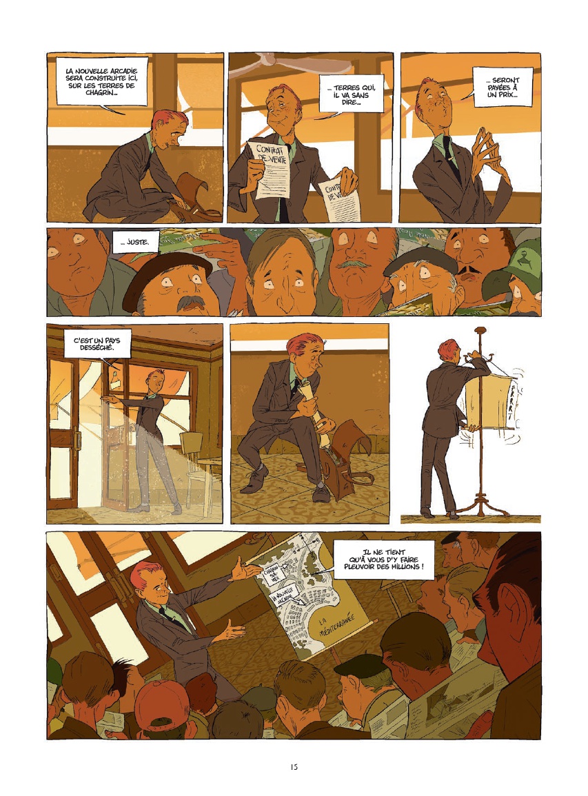 Costume bien ajusté, discours soigneusement préparé et mission parfaitement définie : Prométhée Foiemangé arrive sur la côte méditerranéenne avec un objectif clair. Employé d’un puissant conglomérat à la fin des années 60, il doit convaincre les habitants de Chagrin-sur-mer de vendre leurs terres afin de permettre la construction d’un ambitieux complexe balnéaire baptisé « La Nouvelle Arcadie ». Pour beaucoup, cette initiative représente la promesse d’un avenir prospère. Une dynastie résiste pourtant à cette vision : les Nomdedieu, propriétaires de la portion de littoral la plus convoitée.