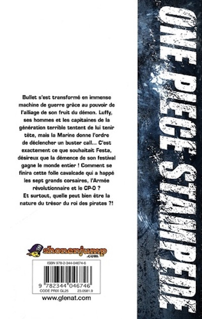 Résumé: Bullet s'est transformé en immense machine de guerre grâce au pouvoir de l'alliage de son fruit du démon. Luffy, ses hommes et les capitaines de la génération terrible tentent de lui tenir tête, mais la Marine donne l'ordre de déclencher un buster call... C'est exactement ce que souhaitait Festa, désireux que la démence de son festival gagne le monde entier ! Comment se finira cette folle cavalcade qui a happé les sept grands corsaires, l'Armée révolutionnaire et le CP-0 ? Et surtout, quelle peut bien être la nature du trésor du roi des pirates ? !