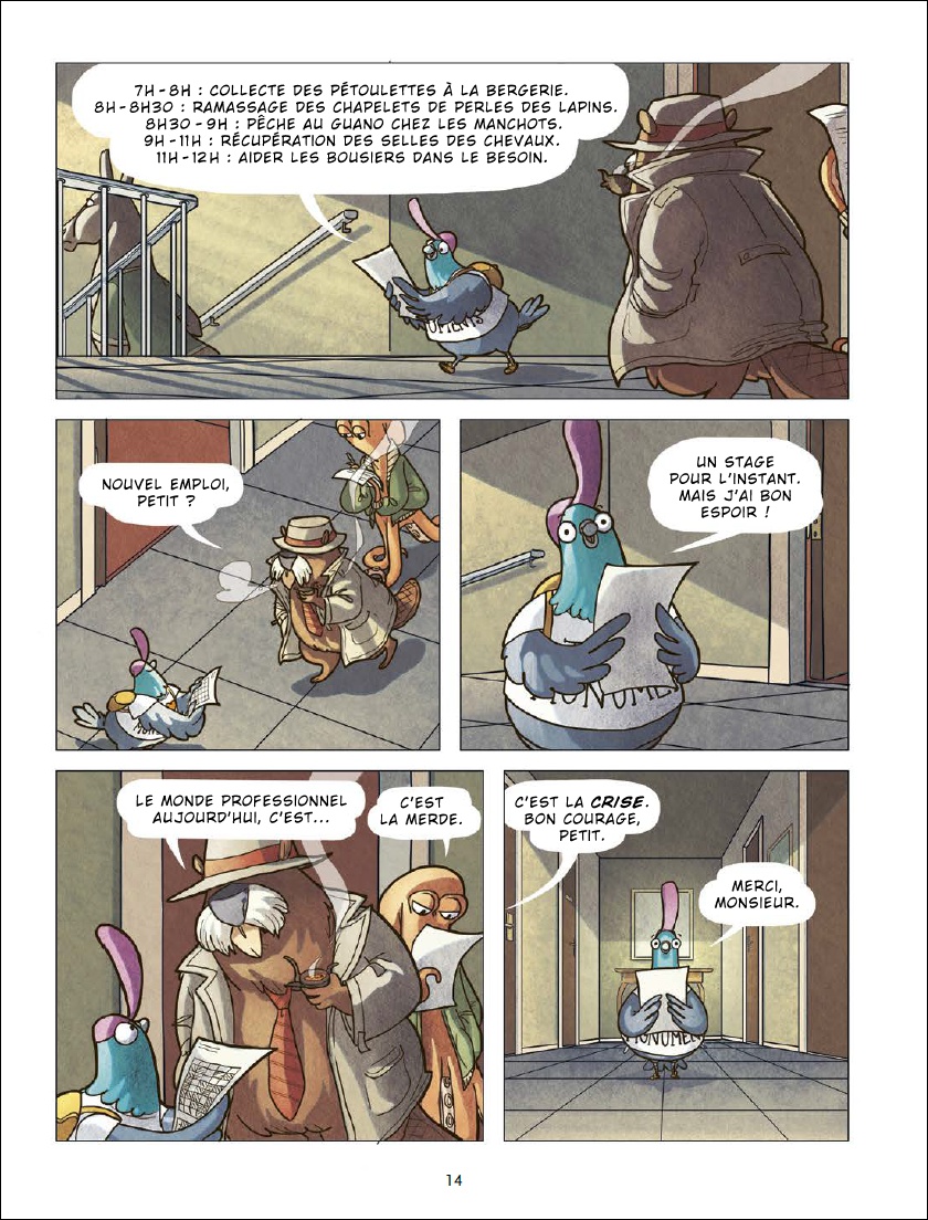 Le rendu global est soigné et enfin, imaginer des mélanges inter-espèces est assez osé et instaure un côté décalé/détournement à plusieurs reprises, ce qui correspond aussi à l'aspect détournement de cette œuvre par rapport à ses références policières (Nestor Burma et le Poulpe).