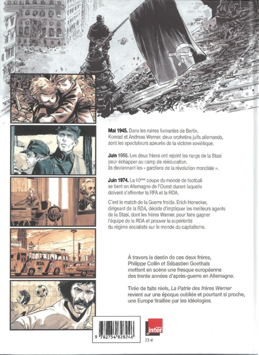 Berlin. Mai 1945. Ils sont deux. Deux orphelins. Juifs ! Comment ont-ils fait pour rester vivants tout au long de la guerre ? Mystère ! Que reste-t-il de Berlin ? Rien ! Enfin, si ! Des ruines. Des cadavres aussi, enfouis sous les décombres. Ils sont inséparables et ne savent où aller. Ils savent juste qu’ils doivent fuir la capitale du Reich. Heureusement, sur leur route d’errance, ils rencontrent un couple disposant d’une charrette qui leur propose de se rendre à Leipzig. Ils embarquent sur cette charrette où git un soldat blessé en bien piteux état… Pas sûr qu’il arrive vivant à Leipzig, lui ! Sur place, les deux frères devront tirer leur plan… Critique : Le football vous intéresse ? Passionnément ? Parfait ! Vous allez vous régaler avec cette page d’histoire footballistique qui va voir s’affronter les deux Allemagnes pour, rien que ça, la Coupe du Monde de juin 1974 qui se tient en RFA. Ce n’est pas une fiction ! Comment ? Le foot vous rend nauséeux ? Vous aimez l’histoire ? Très bien ! Ce livre est écrit pour vous ! Au travers des aventures des frères Werner, c’est la Guerre froide qui pointe son museau infâme. Plus spécialement, la Guerre froide vue du côté est-allemand avec l’omniprésence de la Stasi (la police politique à qui bien peu de choses échappent). Comment ? Je ne vous l’ai pas dit ? Konrad Werner, l’aîné, va se faire pincer en 1953 dans une pharmacie délabrée alors qu’il cherchait de l’Aspirine pour soulager son frère Andreas. C’est à cette occasion qu’ils vont rencontrer le colonel Gronau, fervent communiste. Ce dernier fait à Konrad une proposition que celui-ci ne saurait refuser sous peine de voir son jeune frère expédié en Pologne dans une maison de correction. Le temps passe et les deux frangins se font une place dans la Stasi. Les convictions communistes de Konrad sont bien ancrées contrairement à son frérot qui, au fur du temps qui s’écoule, se met à douter du système… Et le football dans tout ça ? Venez découvrir ce match authentique et extraordinaire qui a opposé les deux Allemagnes, en sachant que la Stasi ne perd jamais de vue ses concitoyens et que les trahisons de toute nature sont vivement encouragées pourvu qu’elles permettent au pouvoir en place en RDA de se maintenir. Le scénario de Philippe Collin, c’est du lourd ! Du très lourd ! Extrêmement bien documenté avec l’appui de l’historien Fabien Archambault qui signe de très belles pages de documentation à la fin de l’album. Le graphisme de Sébastien Goethals est époustouflant et sa « mise en couleur » avec des tons à une seule dominante par planche confère une ambiance vieillotte comme si on découvrait un vieil album de famille. Il a été aidé en cela par Horne Perreard. Les raisons d’acheter ce livre sont multiples : vous aimez l’art, jetez donc un œil à ces planches ! Vous vous intéressez aux relations humaines dans tout ce qu’elles ont de plus complexe : amour fraternel, fidélité aux idées, amour de la liberté, … , ne passez pas à côté de cet ouvrage ! Amateur d’histoire de la fin de la Seconde Guerre mondiale et des années de la Guerre froide, découvrez une page inédite de ce conflit ! Amateurs de sport, sachez ce qui peut se cacher derrière d’un point de vue politique ou sociologique…BDGest 2014 - Tous droits réservés