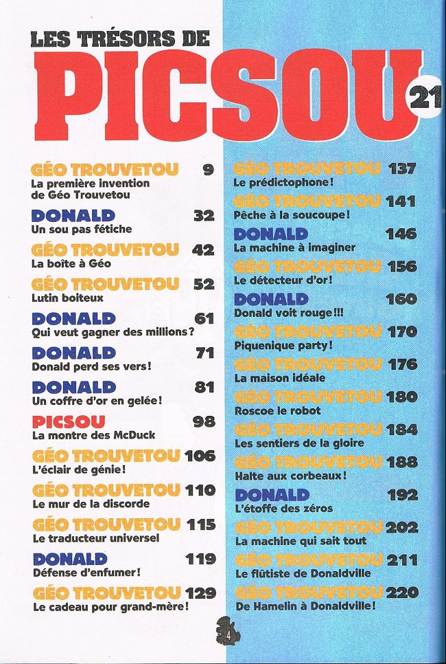 La dernière invention de Géo Trouvetou ( Sc & Des. Don Rosa ) - Donald un sou pas fétiche - La boîte à Géo - Lutin boiteux -Qui veut gagner des millions ? -Donald perd ses vers ! - Un coffre d'or en gelée ! - La montre des McDuck - L'eclair de génie - Le mur de la discorde - Le traducteur universel - Défense d'enfumer ! - Le cadeau pour grand-mère! - Le predictophone ! - Pêche à la soucoupe ! - La machine à imaginer - Le détecteur d'or ! - Piquenique party ! - La maison idéale - Roscoe le robot - Les sentiers de la gloire - Halte aux corbeaux ! - L'étoffe des zéros - La machine qui sait tout (Sc. & Des. Carl Barks) - Le flûtiste de Donaldville (Sc. Carl Barks, Des. Don Rosa ) - De Hamelin à Donaldville (Sc. Carl Barks , Des. Dan Jippes)
