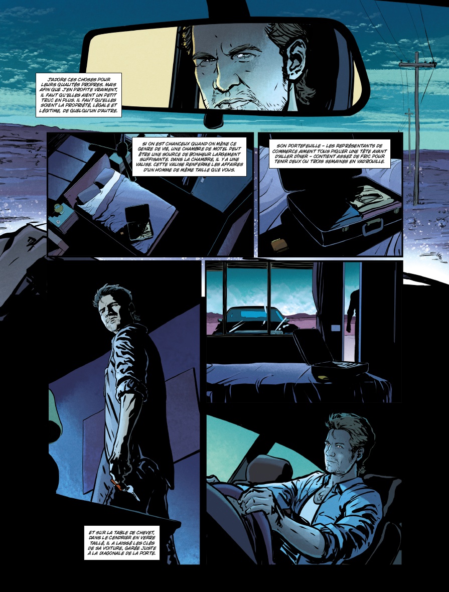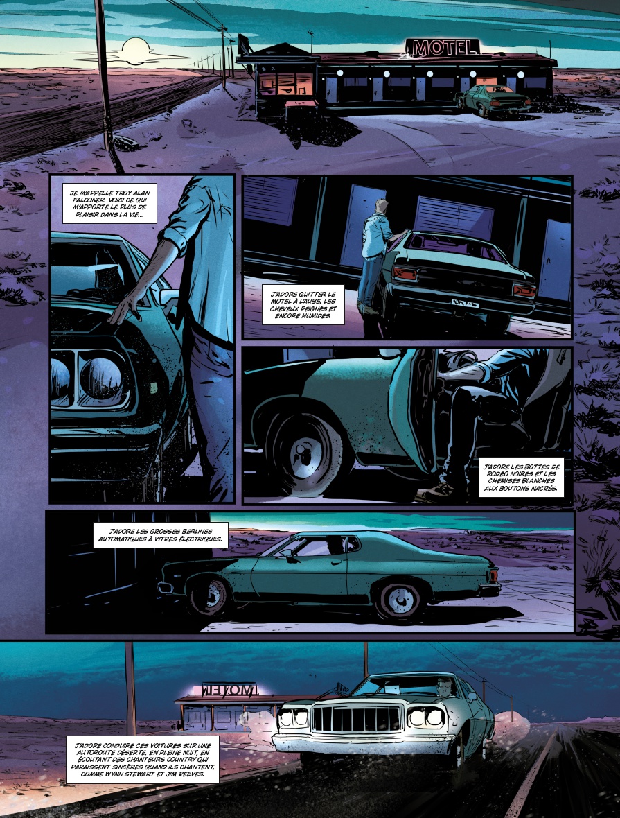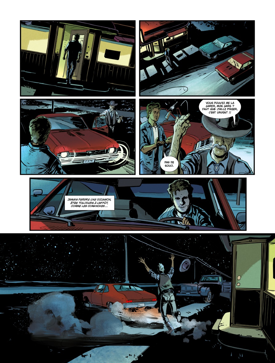 Adaptation du roman du même titre de Randy Kennedy, Presidio est un thriller psychologique organisé en road movie très traditionnel. Personnages très bien caractérisés, un joli mélange entre cynisme, humour et constats humains définitifs, Simon Treins retranscrit parfaitement l’esprit du texte original, le sens de l’espace en moins. En effet, les soixante-dix pages s’avèrent un peu étroites caser «caser» les nombreux sujets abordés par Kennedy. Résultat, là où l’horizon inatteignable, le bruit des roues sur le goudron et la somnolence provoquée par le défilement des kilomètres auraient apporté recul et consistance aux différents échanges et rebondissements, le lecteur a droit à un empilement de scènes de dialogues. Cela est indispensable pour faire avancer l’intrigue, mais se fait au prix du ressenti.