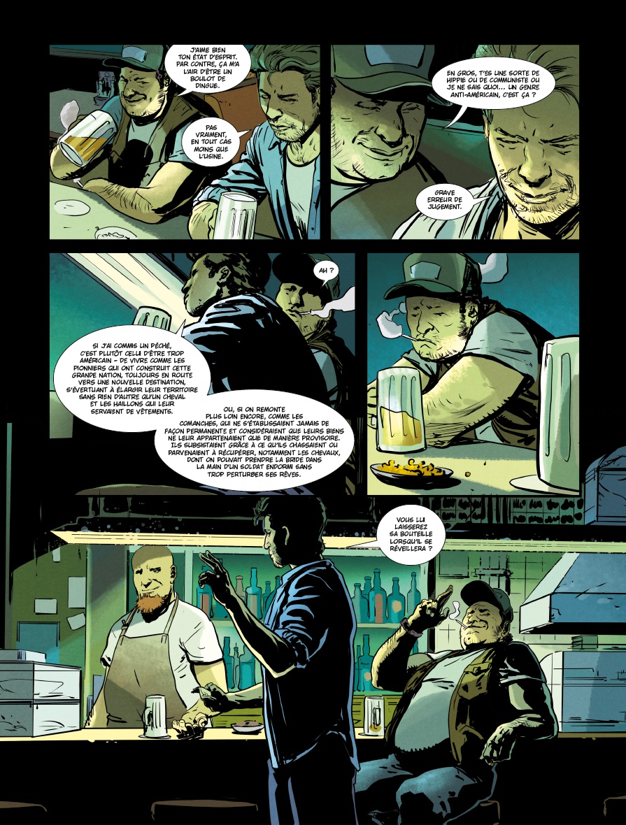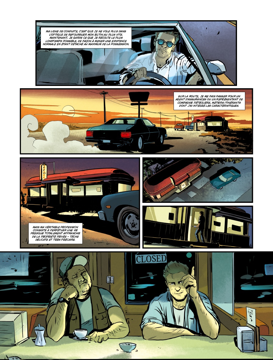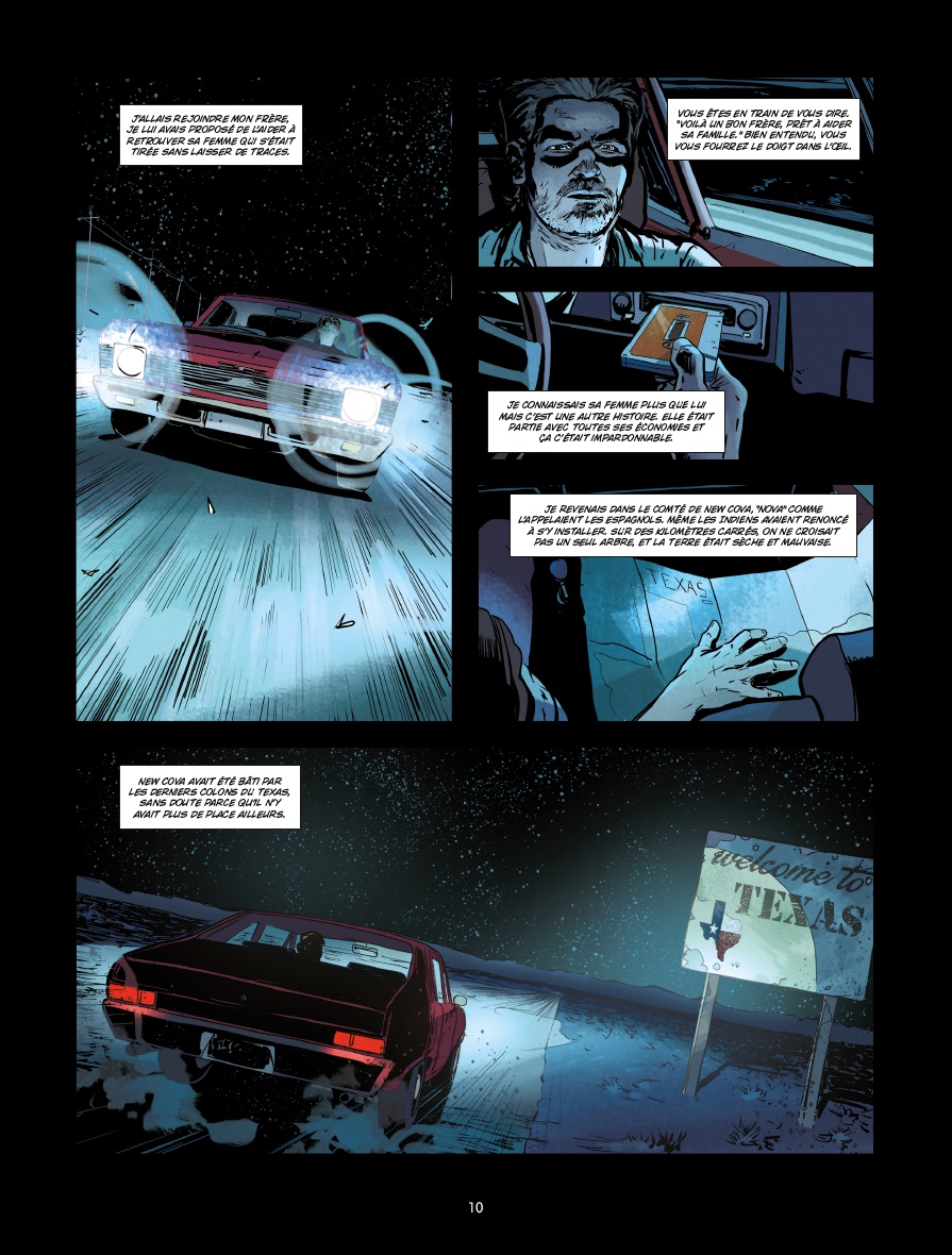 Adaptation du roman du même titre de Randy Kennedy, Presidio est un thriller psychologique organisé en road movie très traditionnel. Personnages très bien caractérisés, un joli mélange entre cynisme, humour et constats humains définitifs, Simon Treins retranscrit parfaitement l’esprit du texte original, le sens de l’espace en moins. En effet, les soixante-dix pages s’avèrent un peu étroites caser «caser» les nombreux sujets abordés par Kennedy. Résultat, là où l’horizon inatteignable, le bruit des roues sur le goudron et la somnolence provoquée par le défilement des kilomètres auraient apporté recul et consistance aux différents échanges et rebondissements, le lecteur a droit à un empilement de scènes de dialogues. Cela est indispensable pour faire avancer l’intrigue, mais se fait au prix du ressenti.