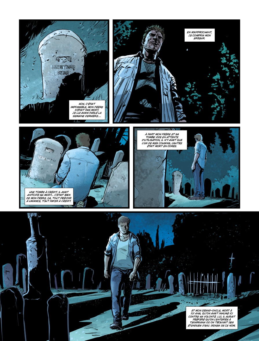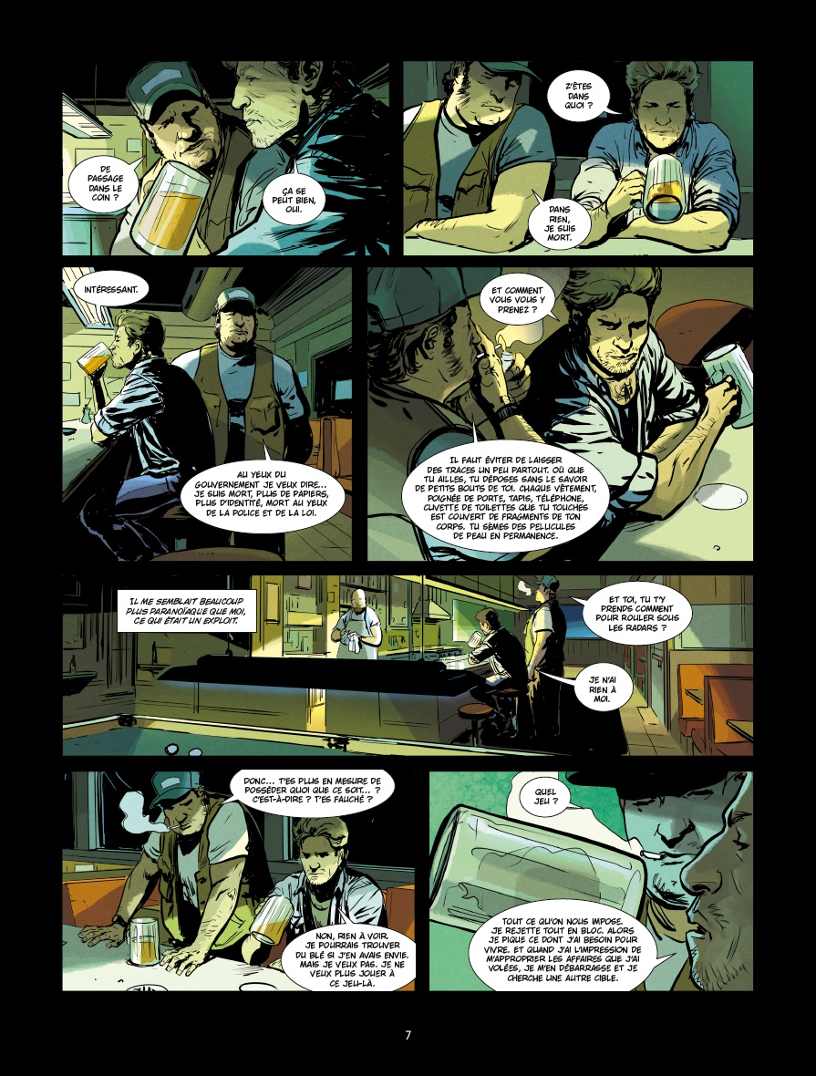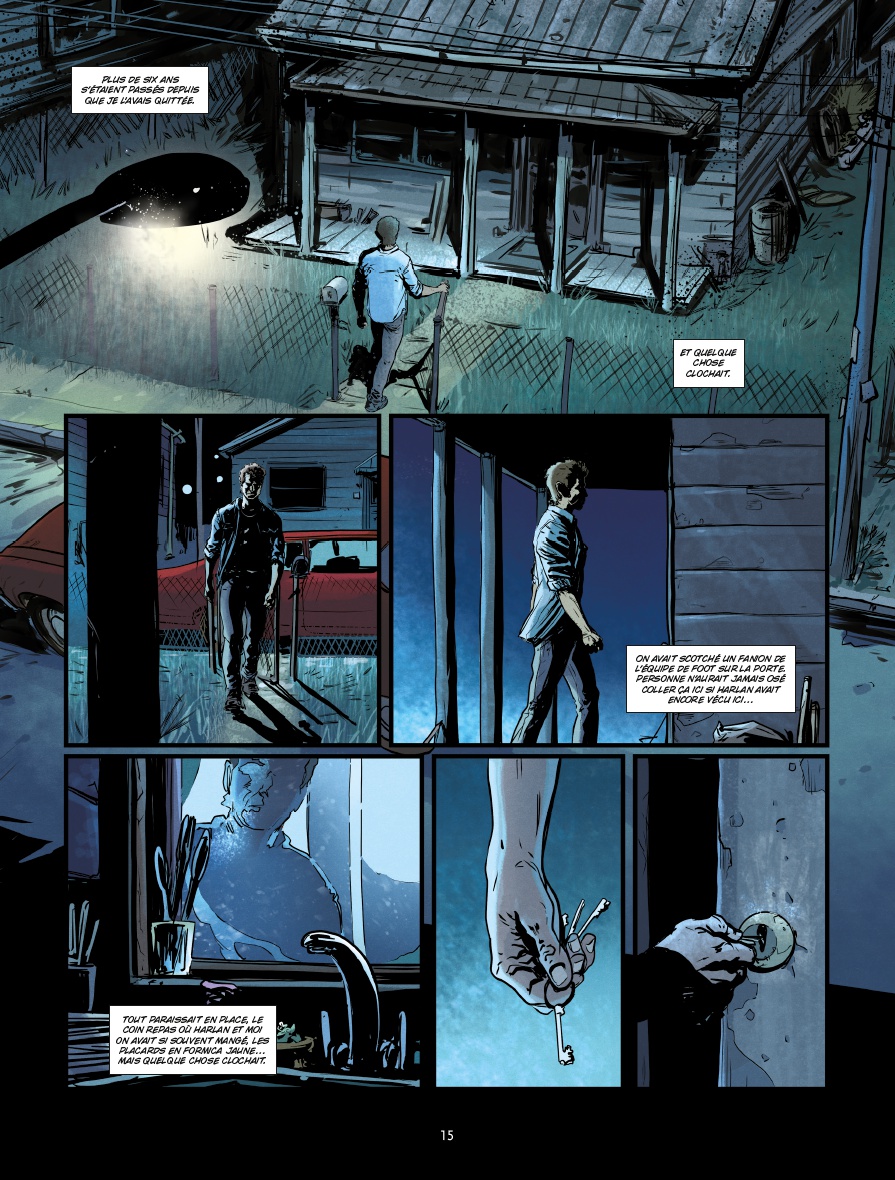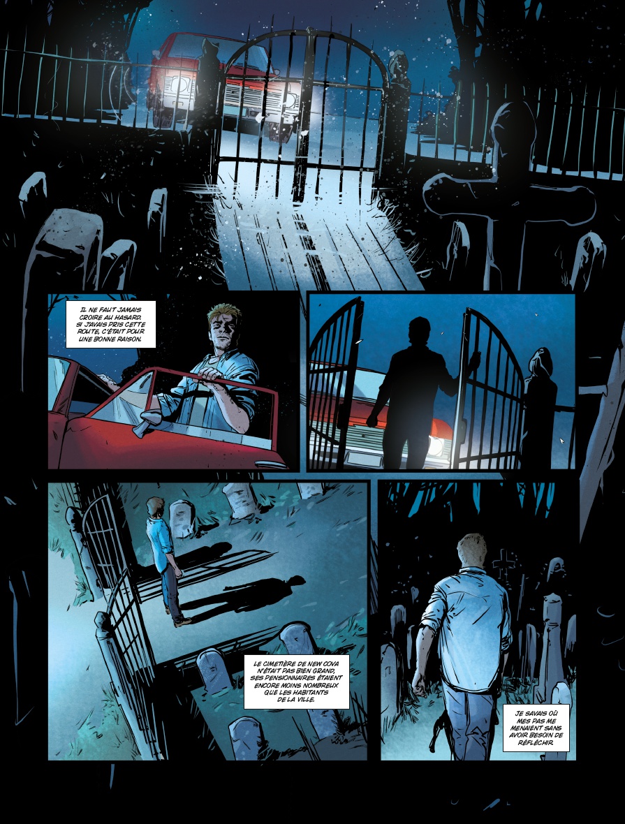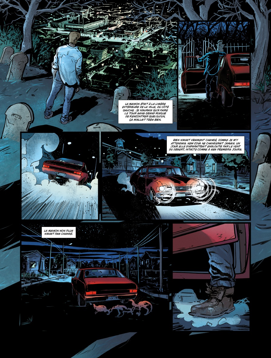 Aux pinceaux, Thibaud Villanova essaye de contourner la situation grâce à un découpage habile. Incrustation de cases, angles de vue serrés, il insuffle du volume et un semblant de rythme à la narration. Par contre, un peu de «vide» et autres instants purement contemplatifs auraient été les bienvenus pour faire ressortir ou partager l’ambiance de cet univers clos et infini à la fois. Ici, elle est plutôt imposée que suggérée. Pour le reste, le trait se montre solide et les couleurs de Bertrand Denoulet accompagnent très bien les planches.