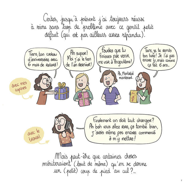 Positive attitude, autodérision et optimisme (dans la majorité des cas) guident Procrastination écologique, recueil de chroniques dessinées parues dans Matin !, la revue numérique des éditions Dargaud. Sous la forme d’un cheminement personnel, l’autrice propose des trucs et des astuces afin d’être plus vert.e dans le cadre d’une vie urbaine, connectée et constamment assaillie par les tentations et la pression sociale des agences de marketing.