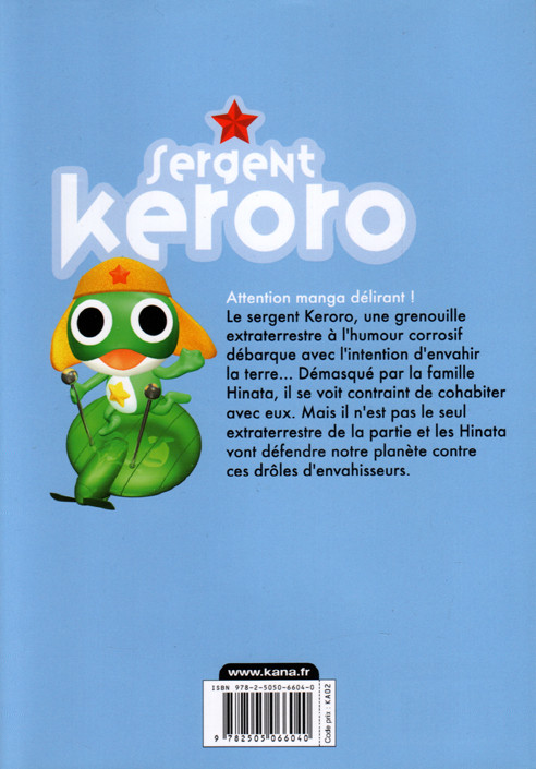 Résumé: Le sergent Keroro, une grenouille verte extraterrestre coiffée d'une casquette à rabats, constitue l'avant-garde de l'invasion de la Terre par son peuple. Pauvres de nous ?! Pas vraiment car il devra d'abord convaincre la famille Hinata qui l'a recueilli, du sérieux de cette invasion et ce n'est pas gagné ! De leur côté, les frère et soeur Fuyuki, et Natsumi Hinata auront toutes les peines du monde à éviter les catastrophes que Keroro ne manque pas de provoquer !