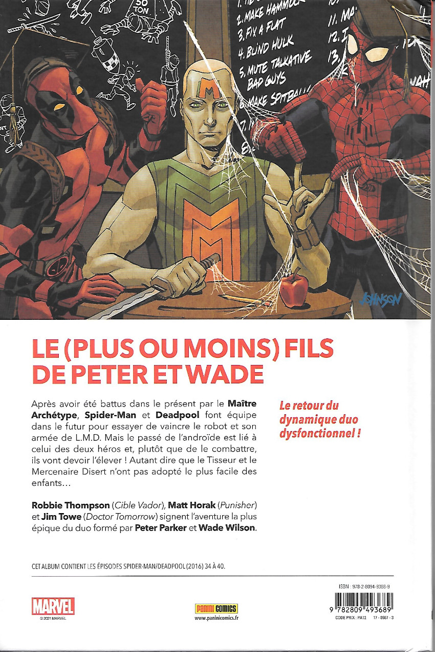 Résumé: Revoici Spider-Man et Deadpool dans de nouvelles aventures en tandem. Ils sont ravis ! Enfin, surtout Deadpool… Les deux héros vont jouer les baby-sitters d'un robot aux pouvoirs terrifiants dans une aventure à cheval entre présent et lointain futur.